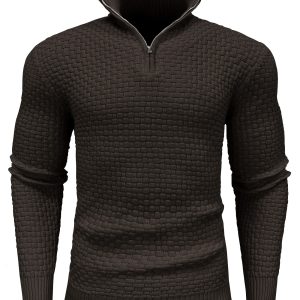Men’s Elegant Brown Knit Top with Subtle Stand Collar and 1u002F4 Zipper Detail – Long Sleeve, Polyester, Perfect for Casual to Semi-Formal Wear
