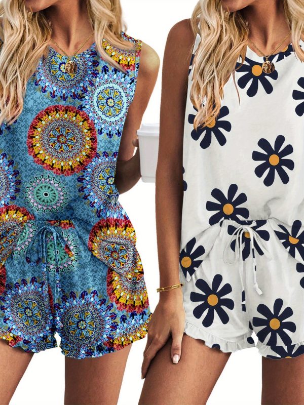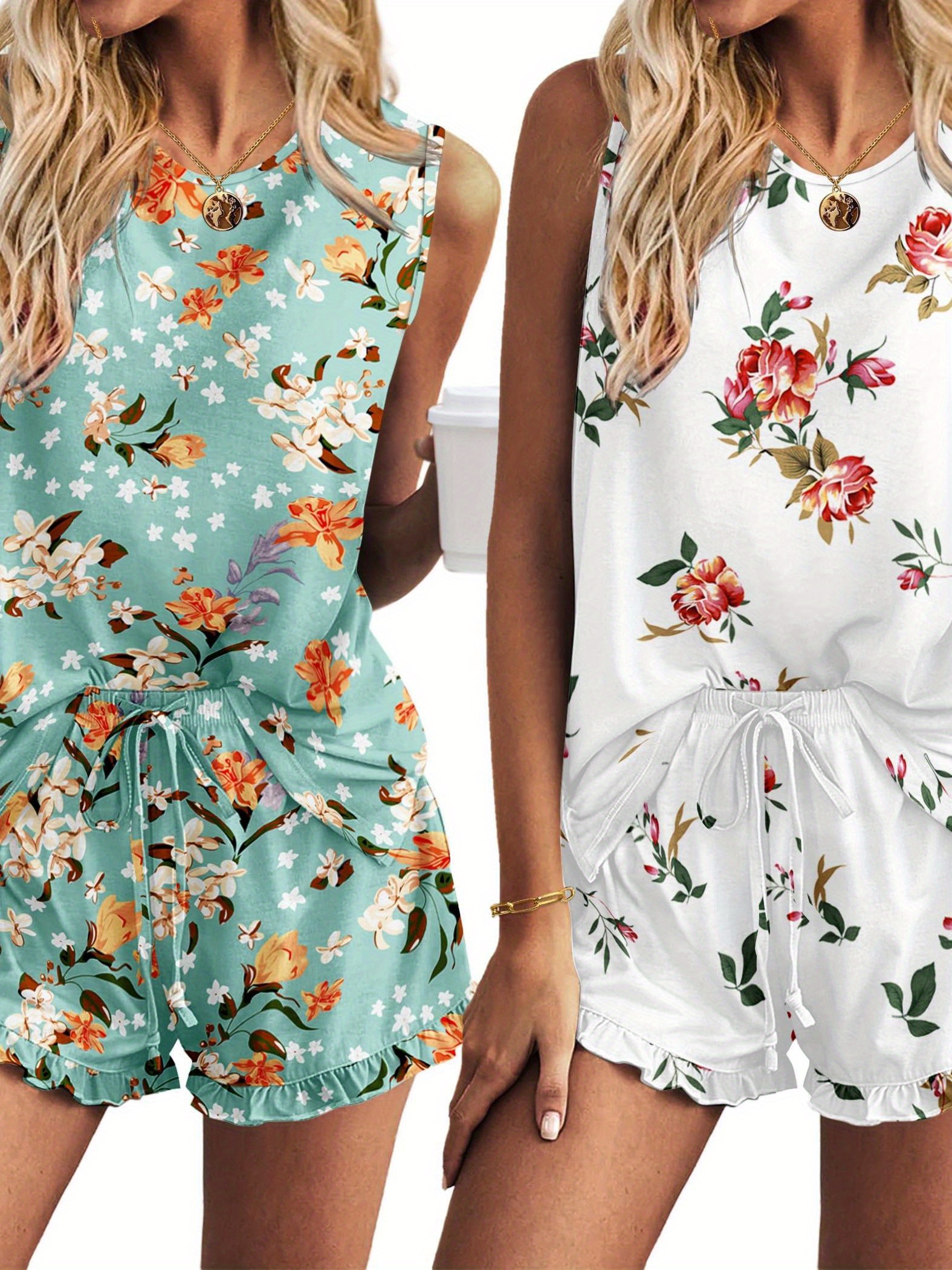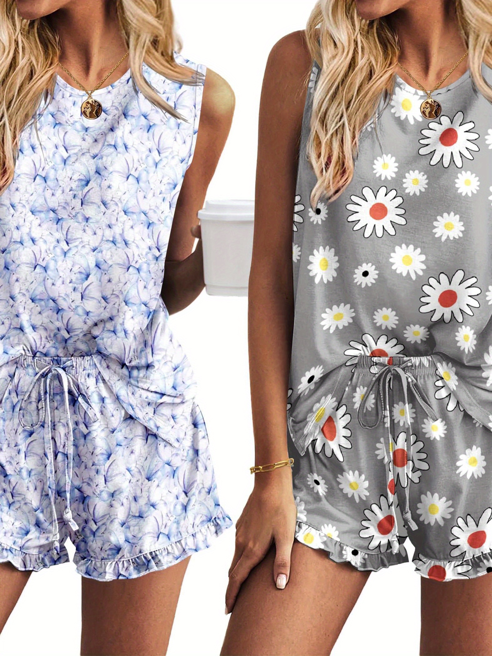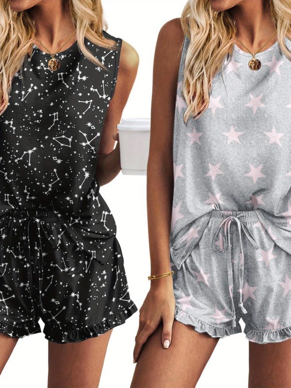 2pcs Women’s Soft Pajama Set – Floral & Celestial Print Tank Top and Ruffle Shorts with Pockets, Comfy Polyester Loungewear, S-XXL