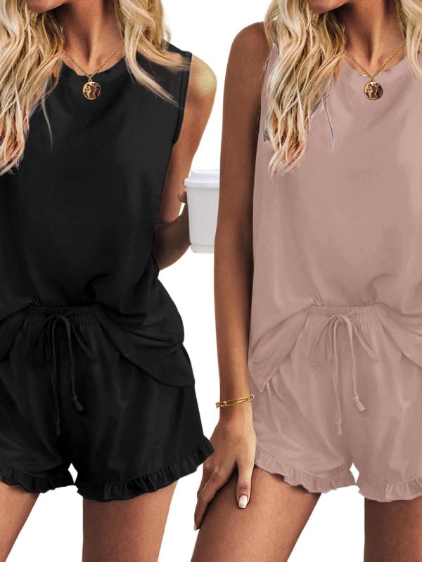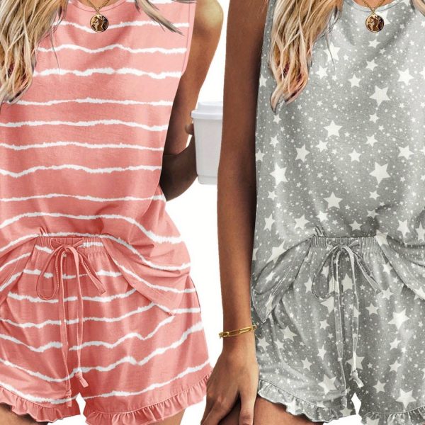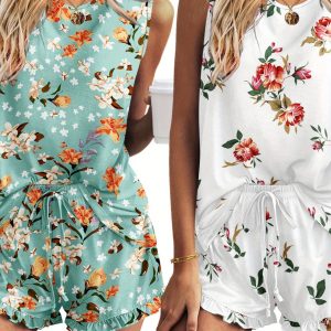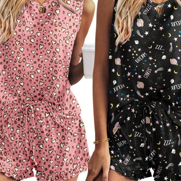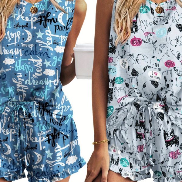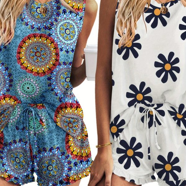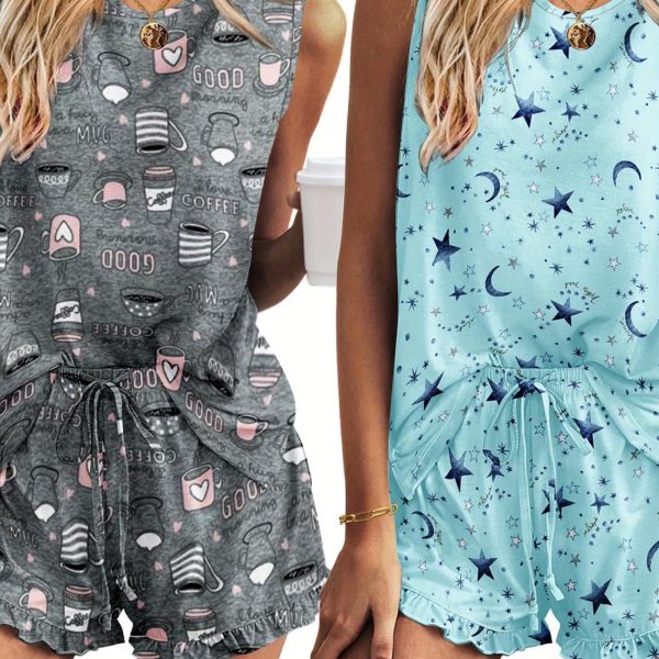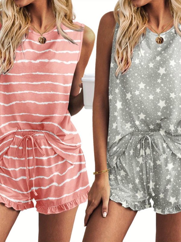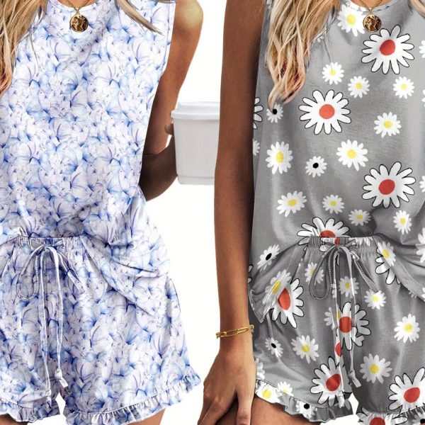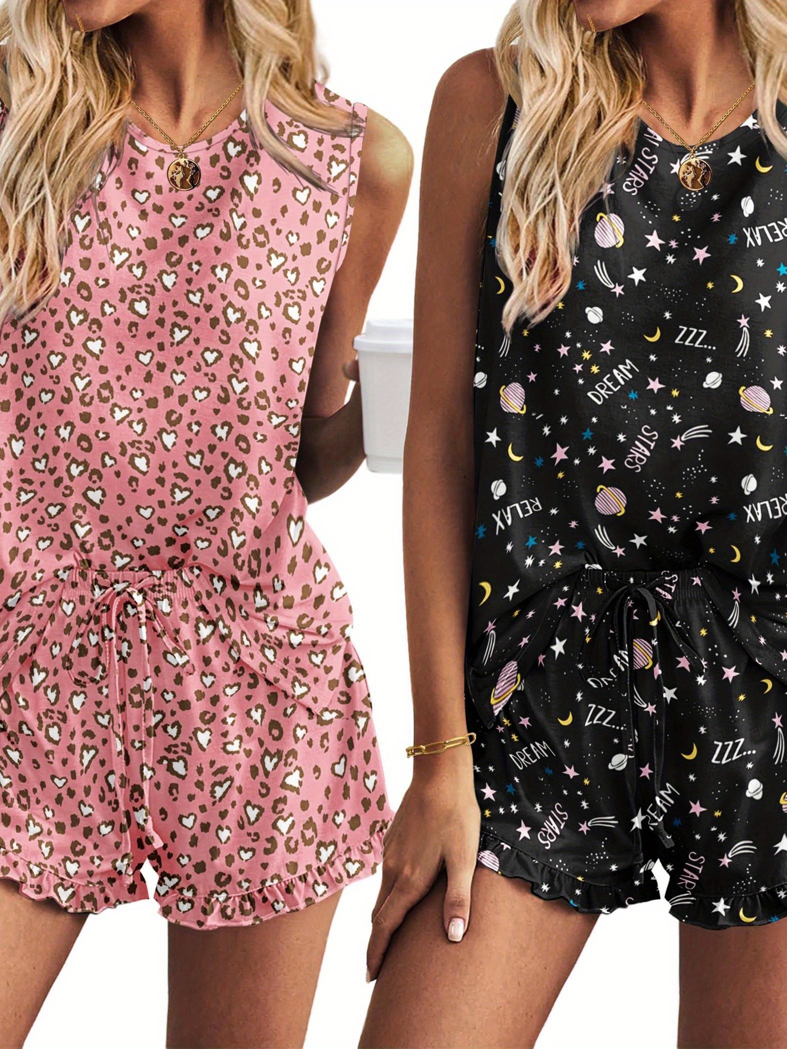 2pcs Women’s Soft Pajama Set – Floral & Celestial Print Tank Top and Ruffle Shorts with Pockets, Comfy Polyester Loungewear, S-XXL