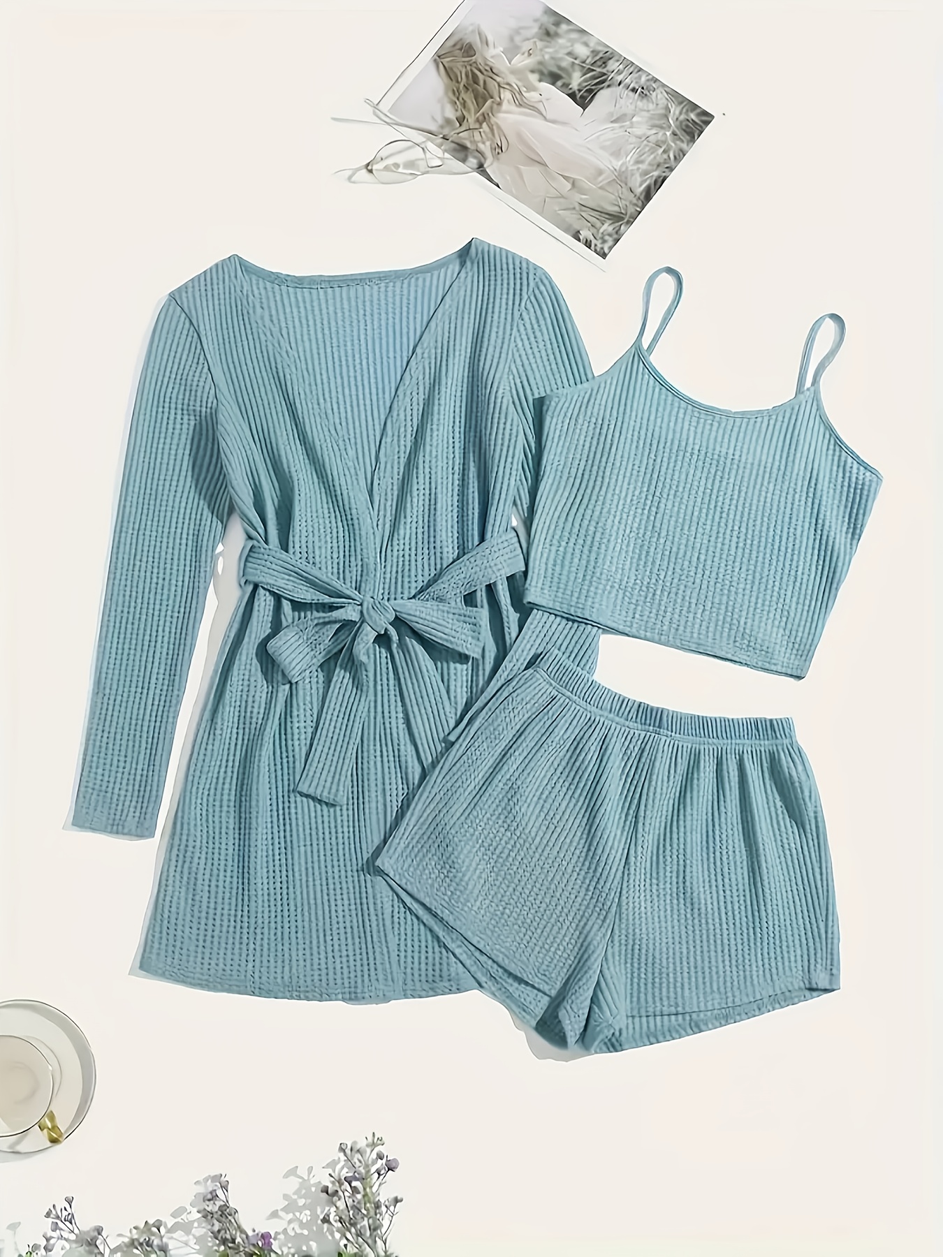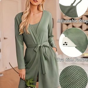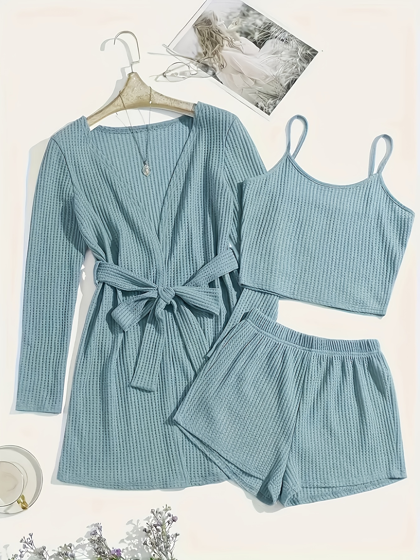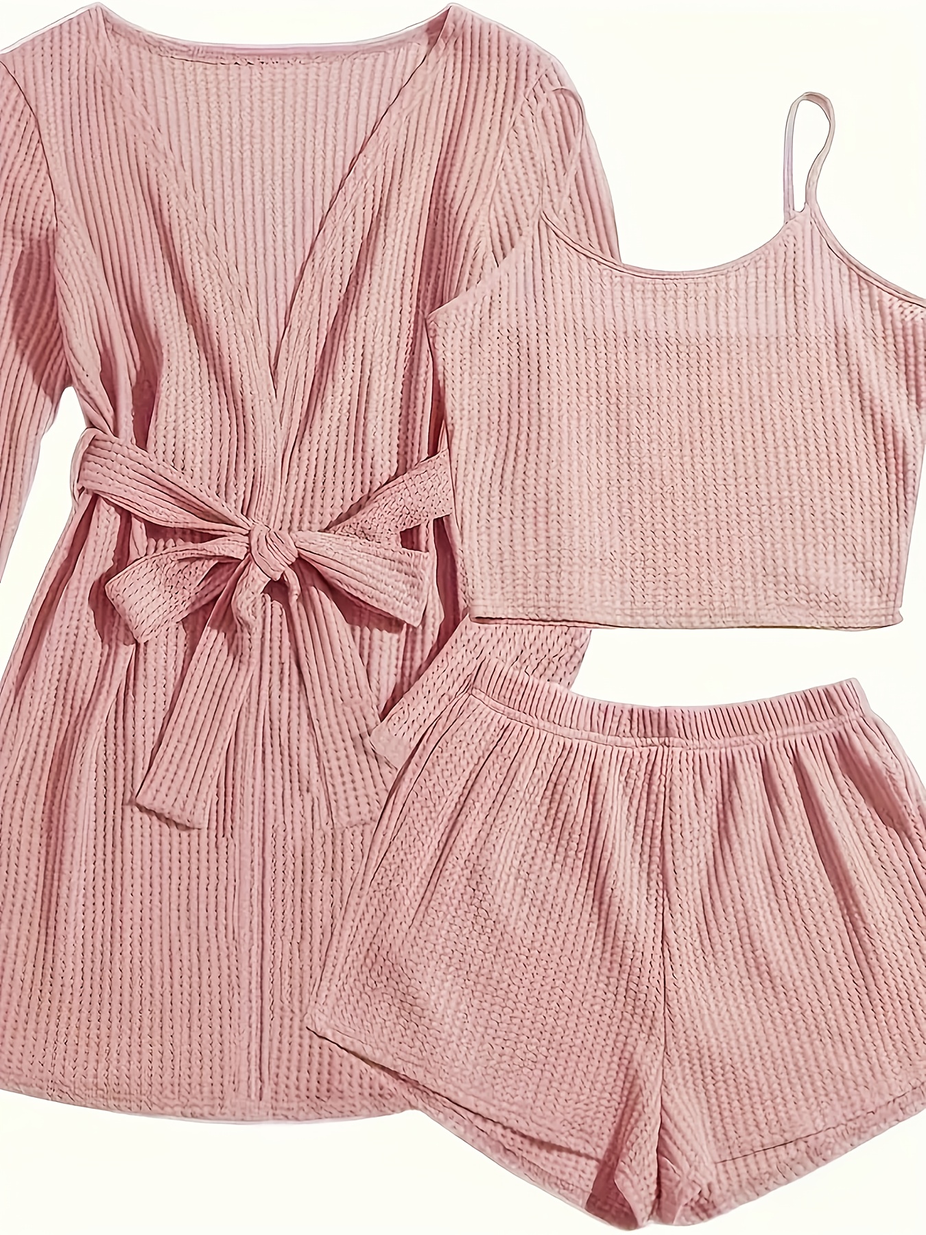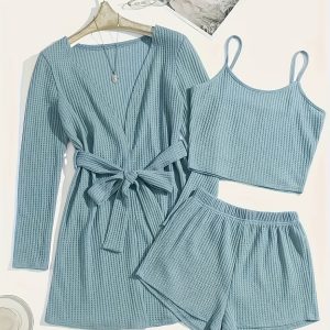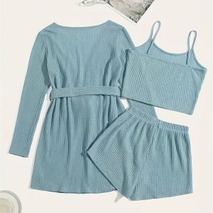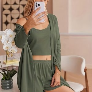 3pcs Casual Pajama Set outer Robe, Vest, And Shorts Loose, Soft, And Comfortable Women’S Pajama Set