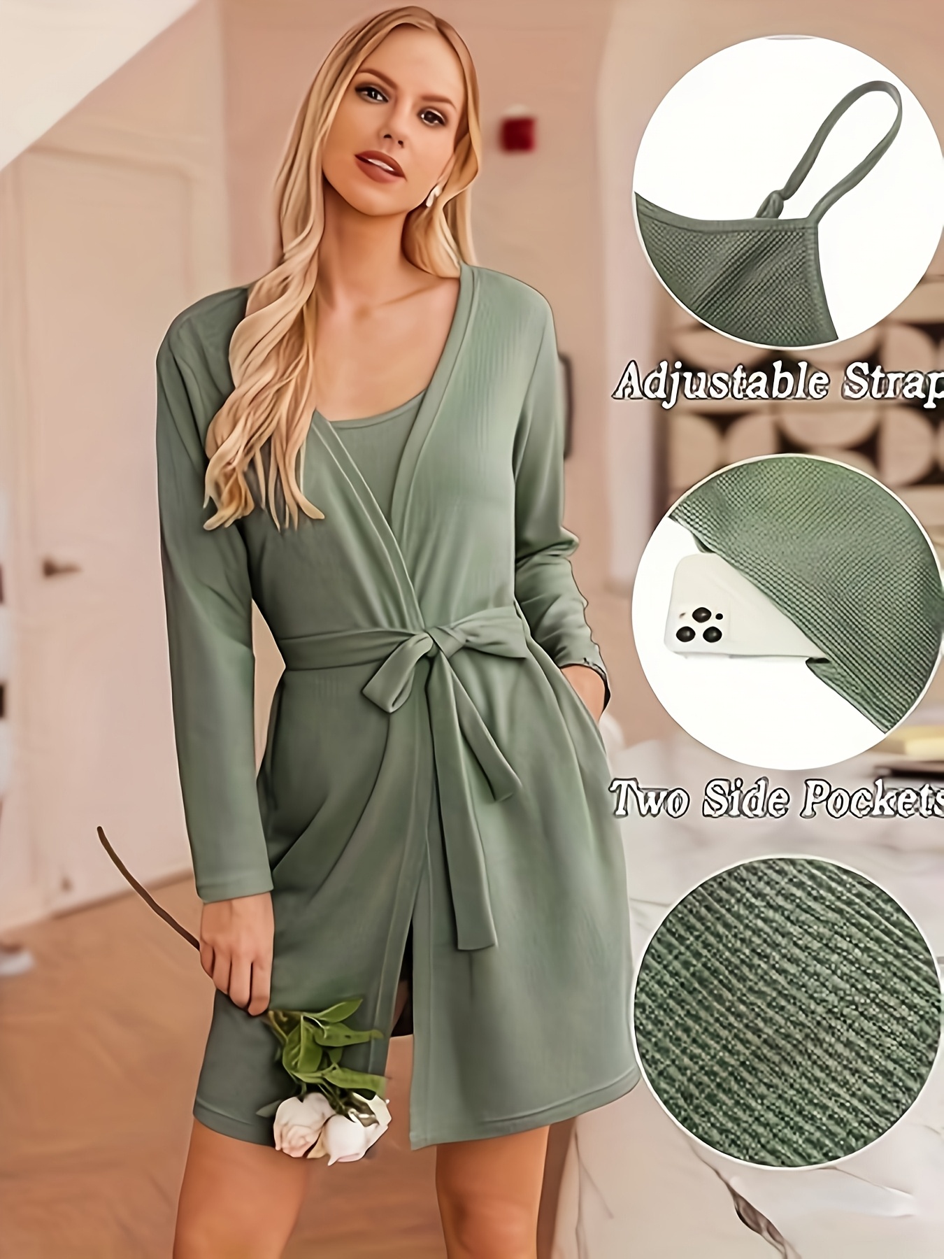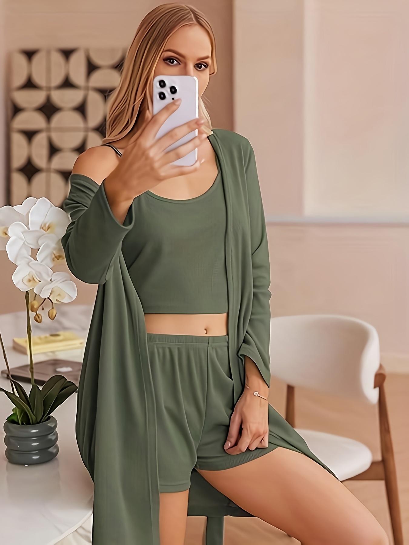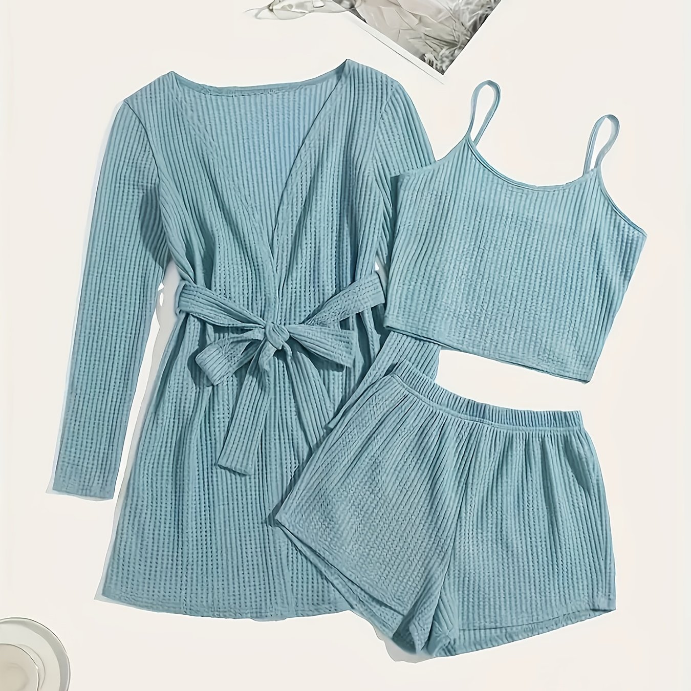 3pcs Casual Pajama Set outer Robe, Vest, And Shorts Loose, Soft, And Comfortable Women’S Pajama Set