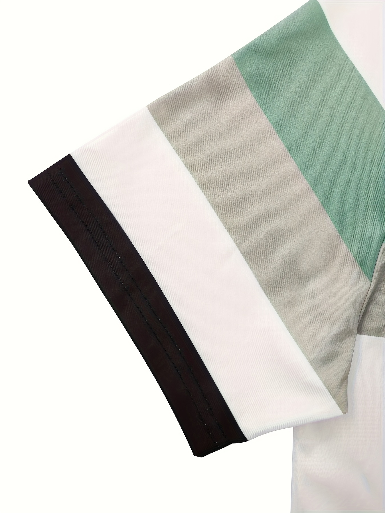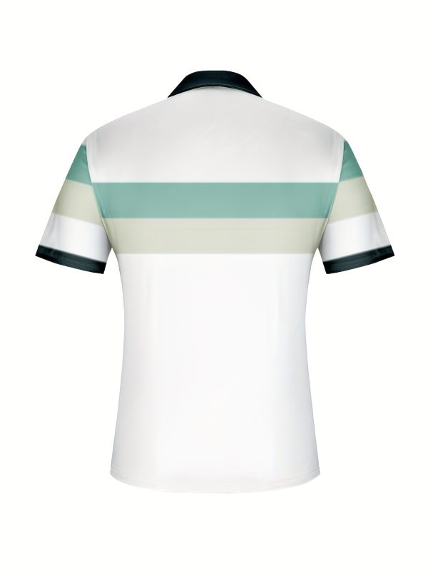 Breathable Striped Shirt Summer Breathable Men’s Casual Striped Shirt | Short Sleeve with Button Detail, White Base with Green & Black Stripes, Classic Collar Design, Contrast Stripe Design, Golf & Tennis Wear