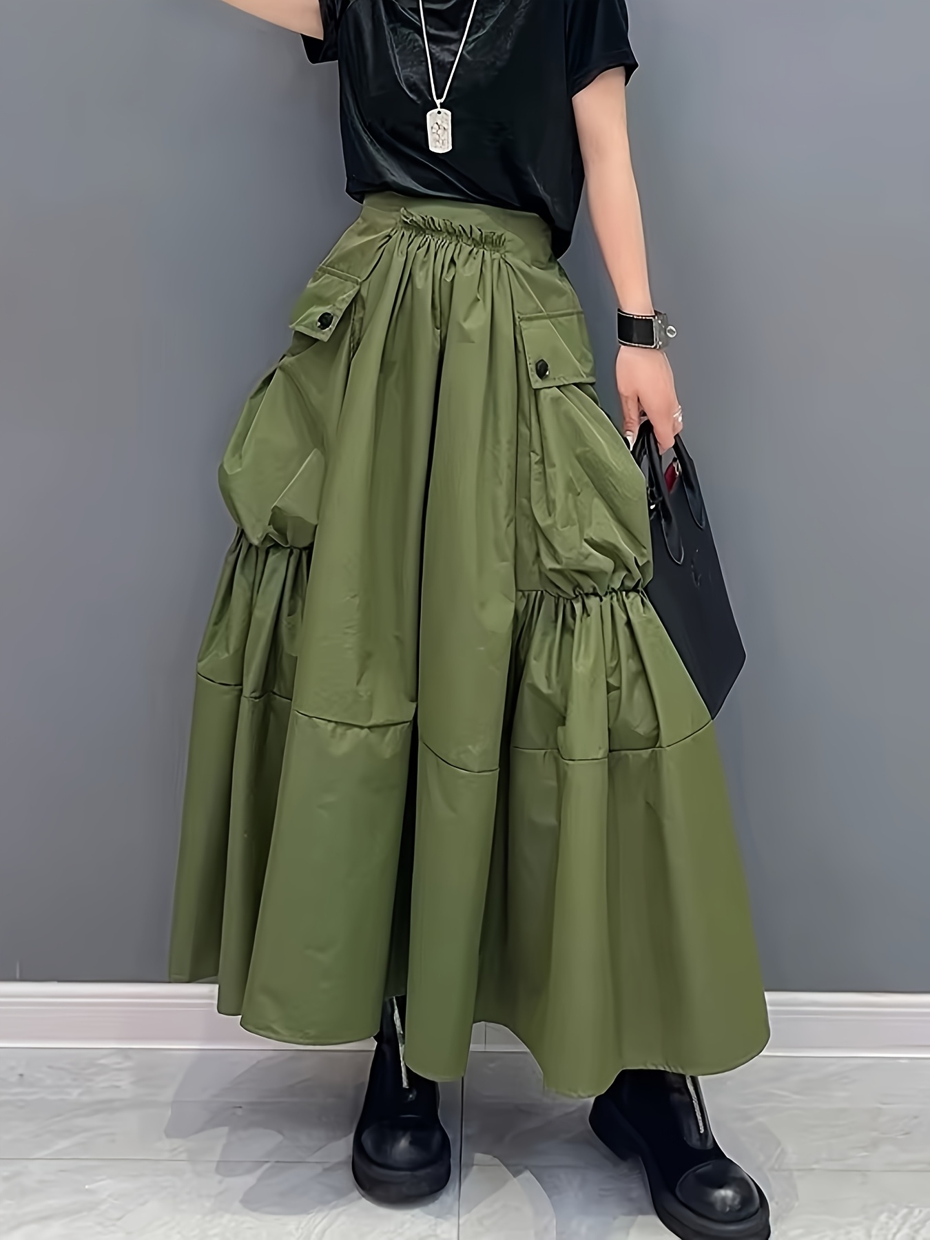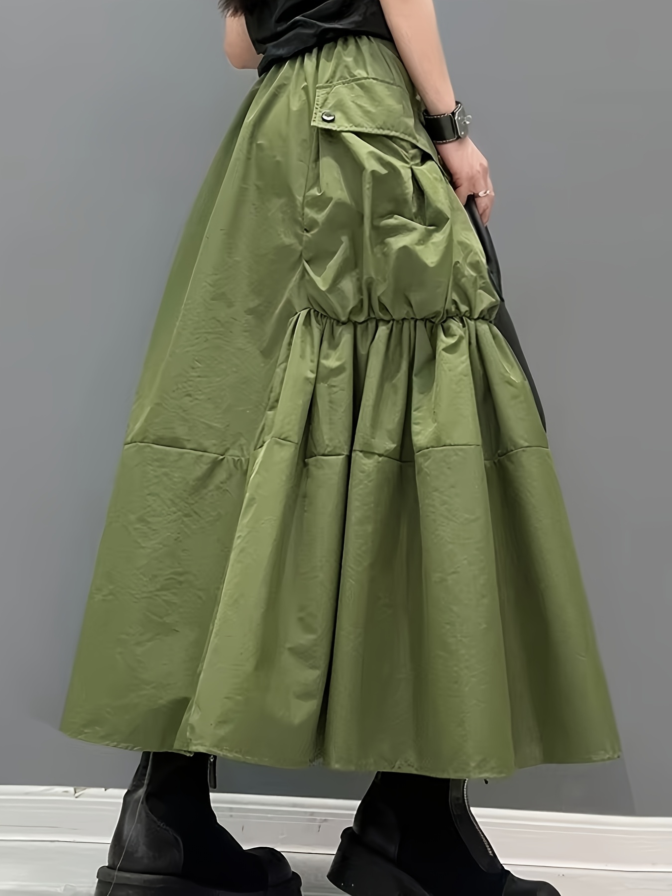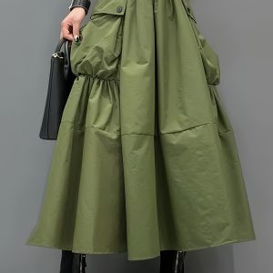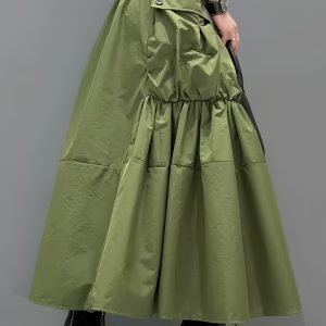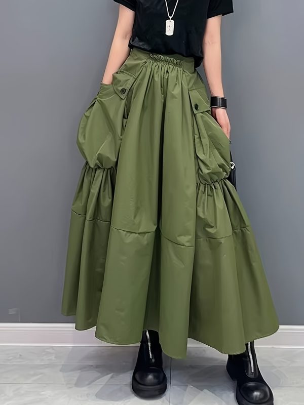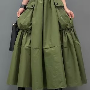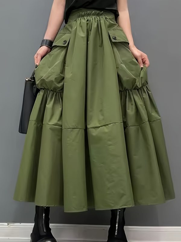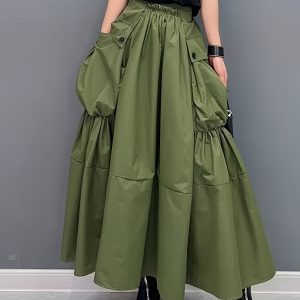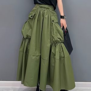 Casual Midi Skirt Lightweight Polyester Women’s A-Line Pleated Midi Skirt | Elastic Waistband & Large Pockets – Casual Korean Style, Green