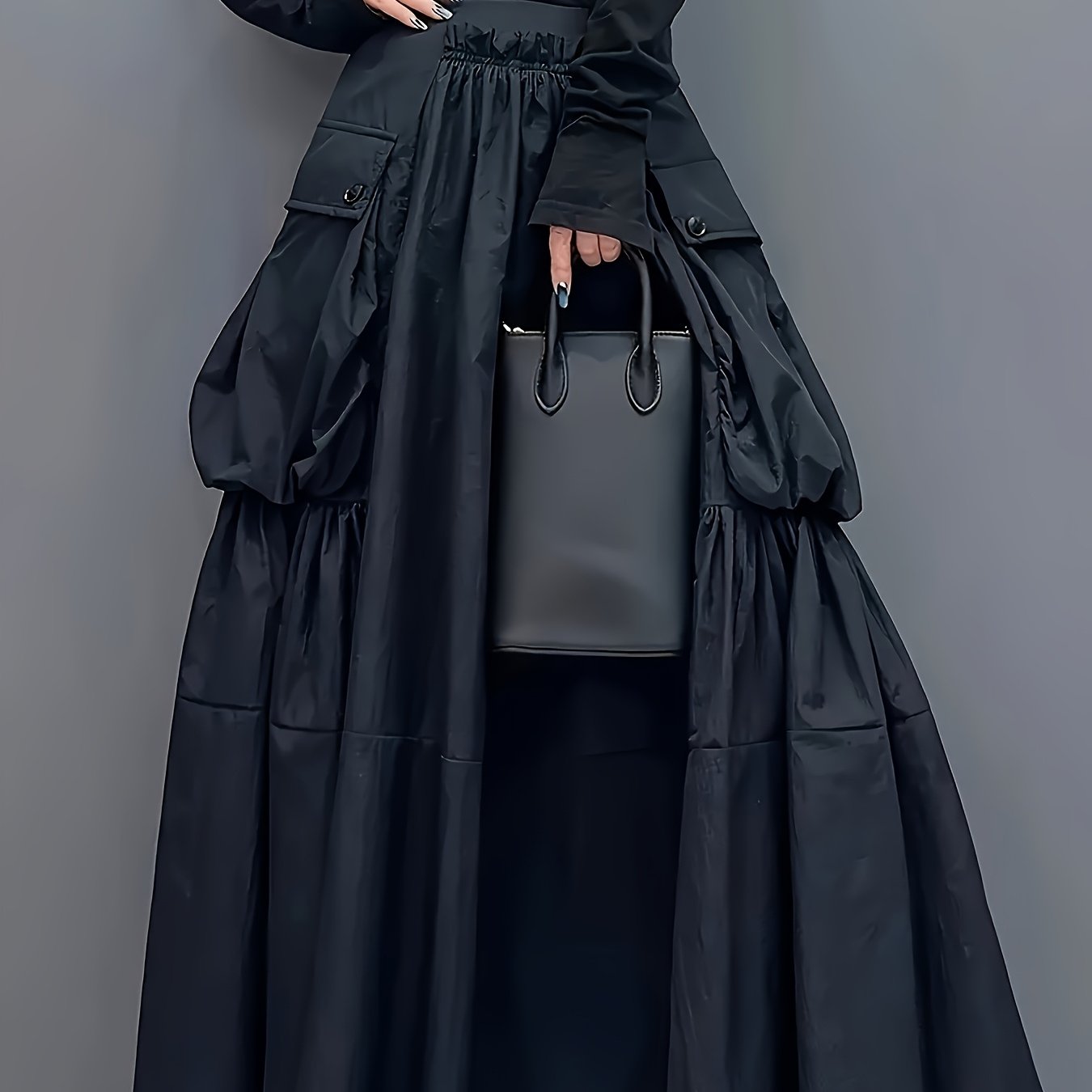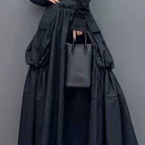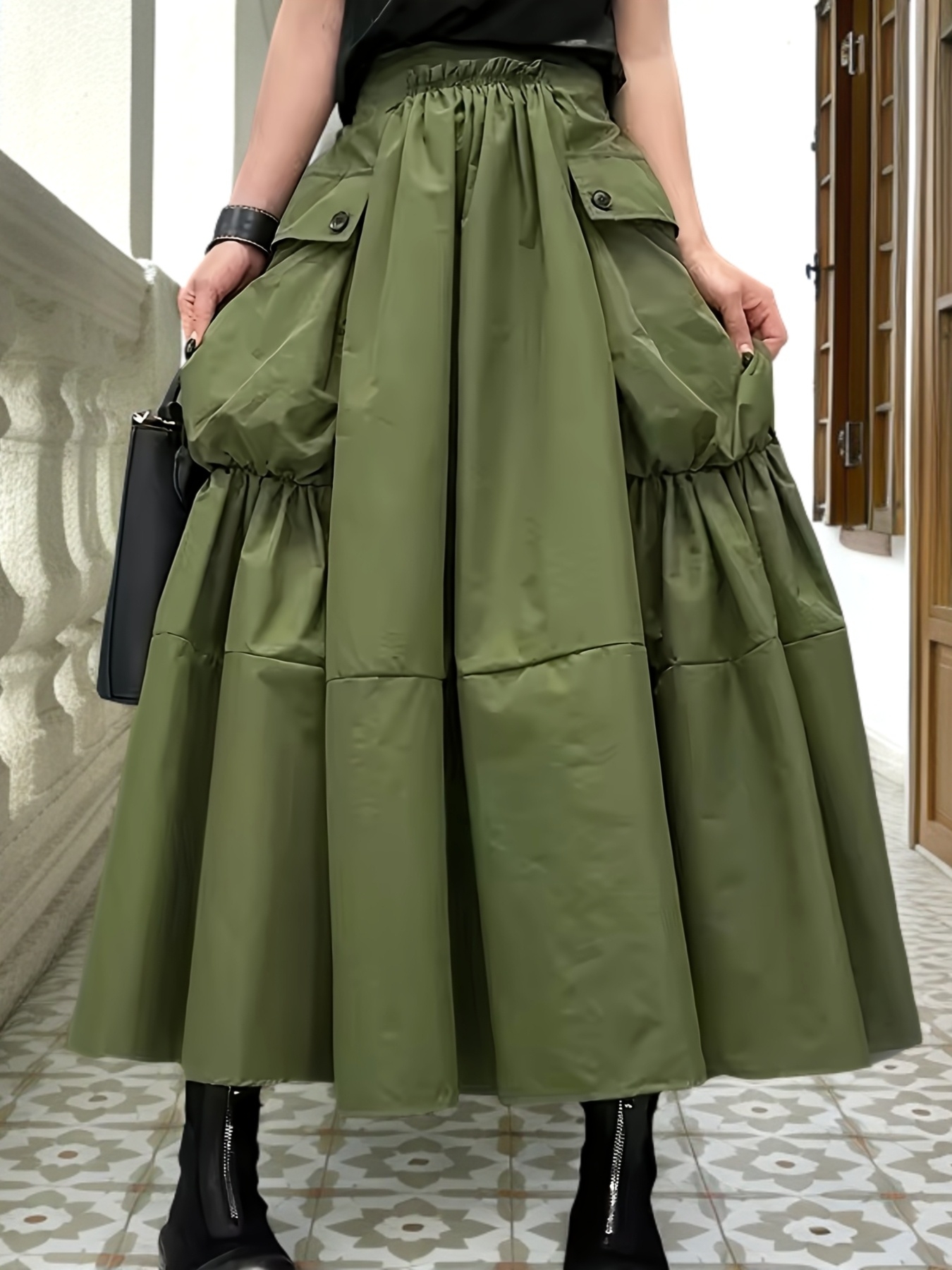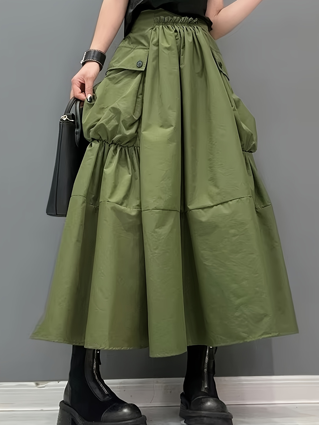 Casual Midi Skirt Lightweight Polyester Women’s A-Line Pleated Midi Skirt | Elastic Waistband & Large Pockets – Casual Korean Style, Green