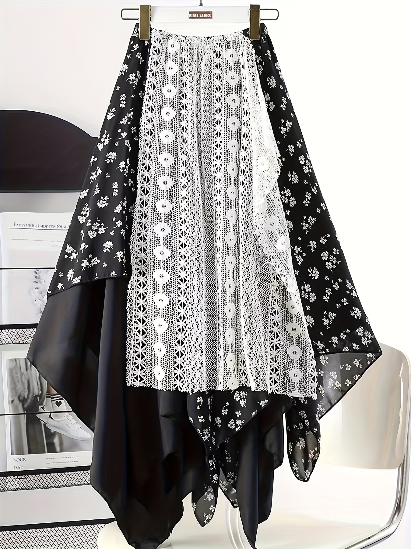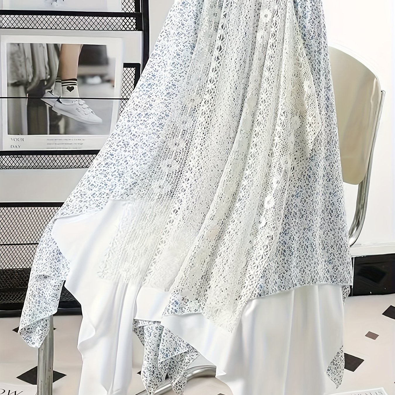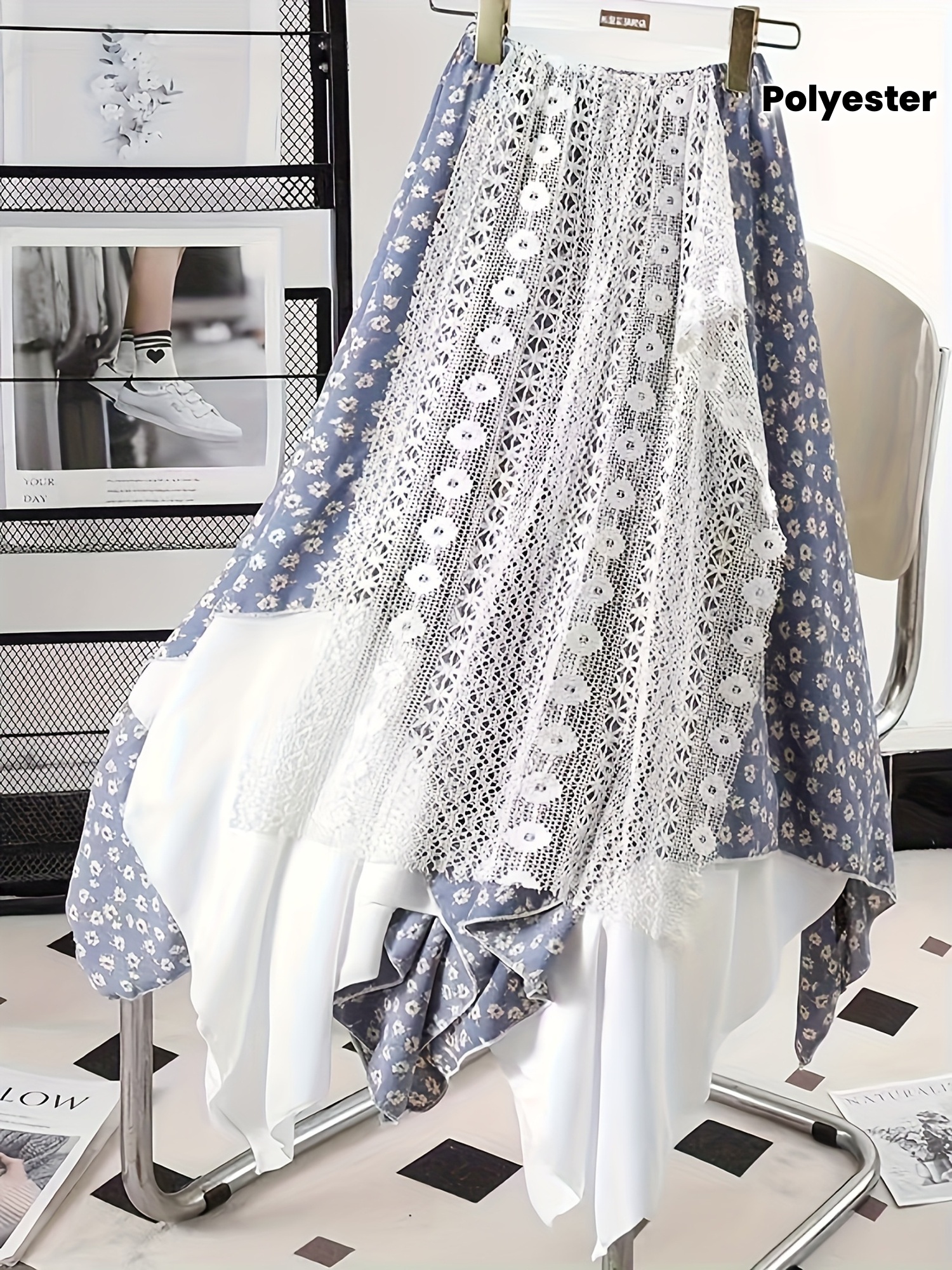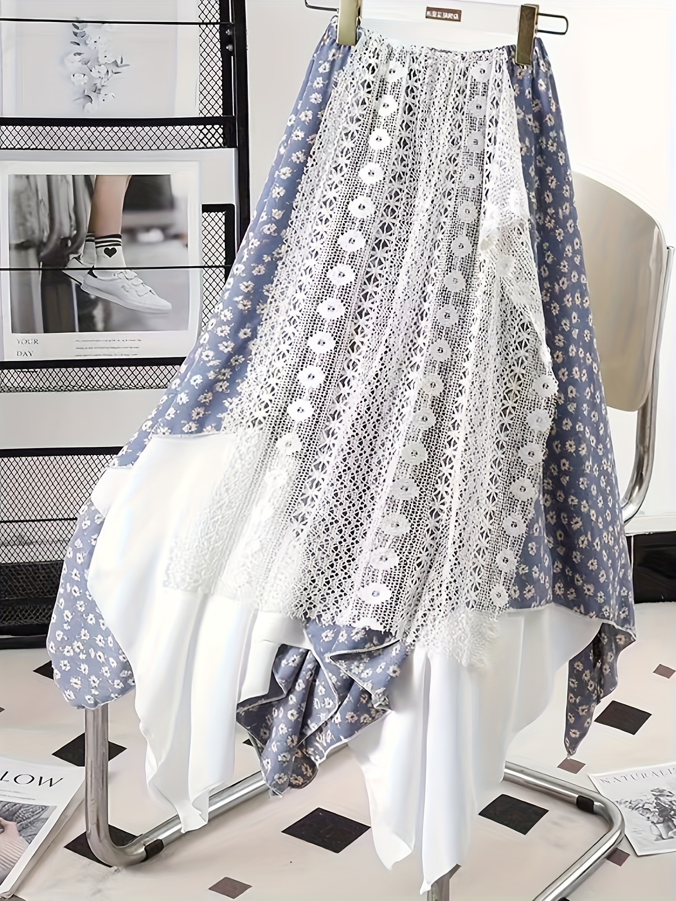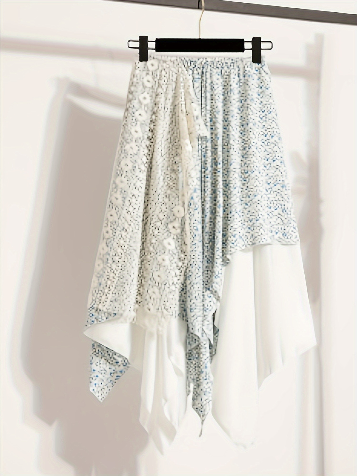 Chic Skirt Light Blue Floral Skirt, Chic Mid-Length Irregular A-Frame Design | Contrast Lace Detail – Versatile All-Season Fashion Accessory