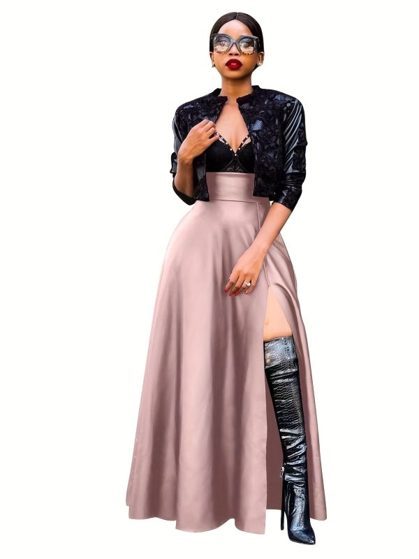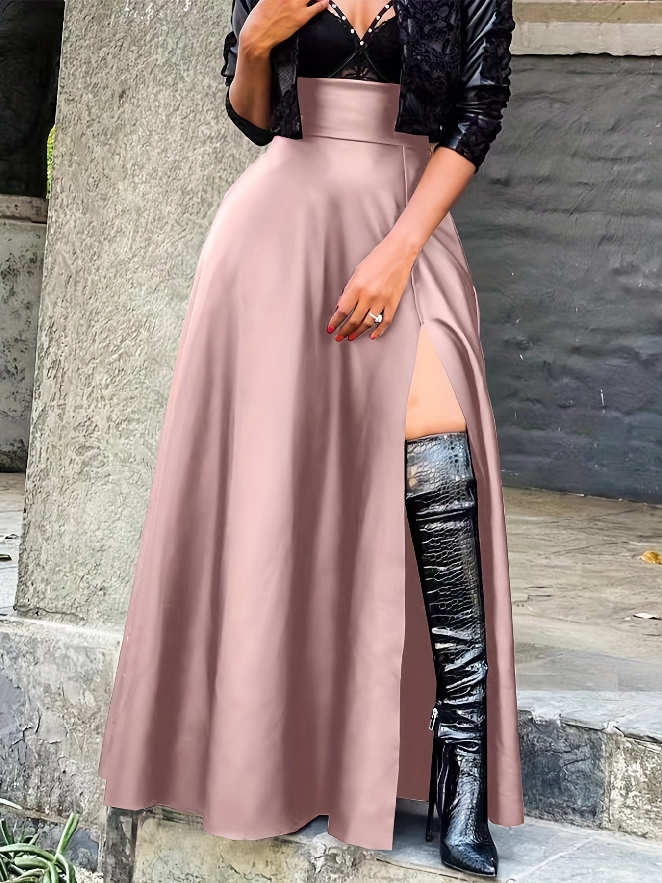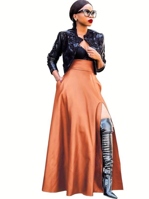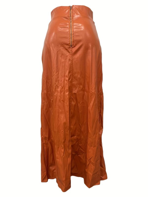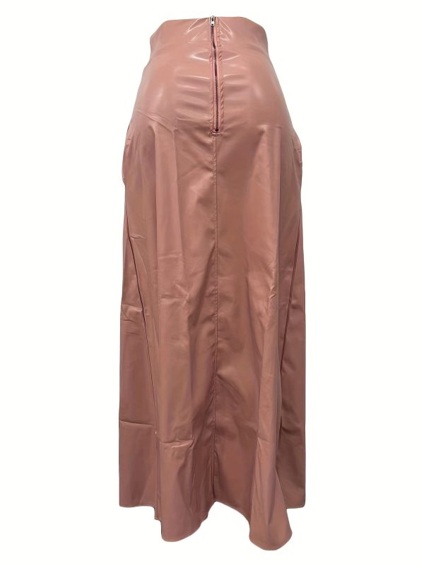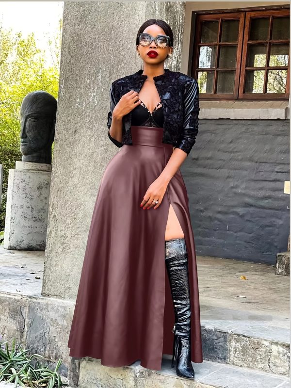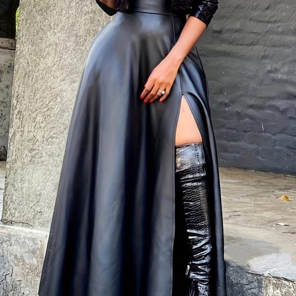 Long Length High Waist PU Leather Split Skirt – Elegant, Micro Elastic, Slit Hem, Machine Washable, Solid Color – Perfect for Spring & Summer, Womens Casual Wear