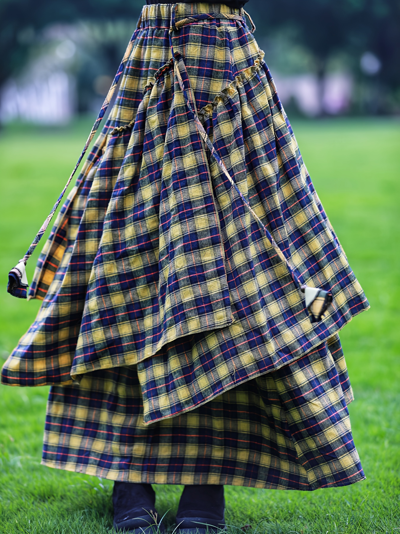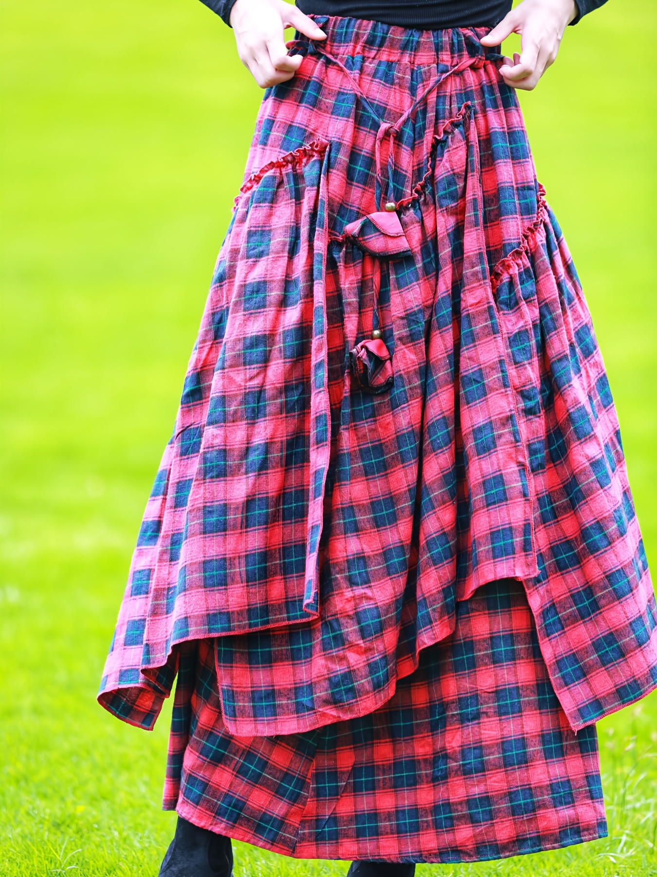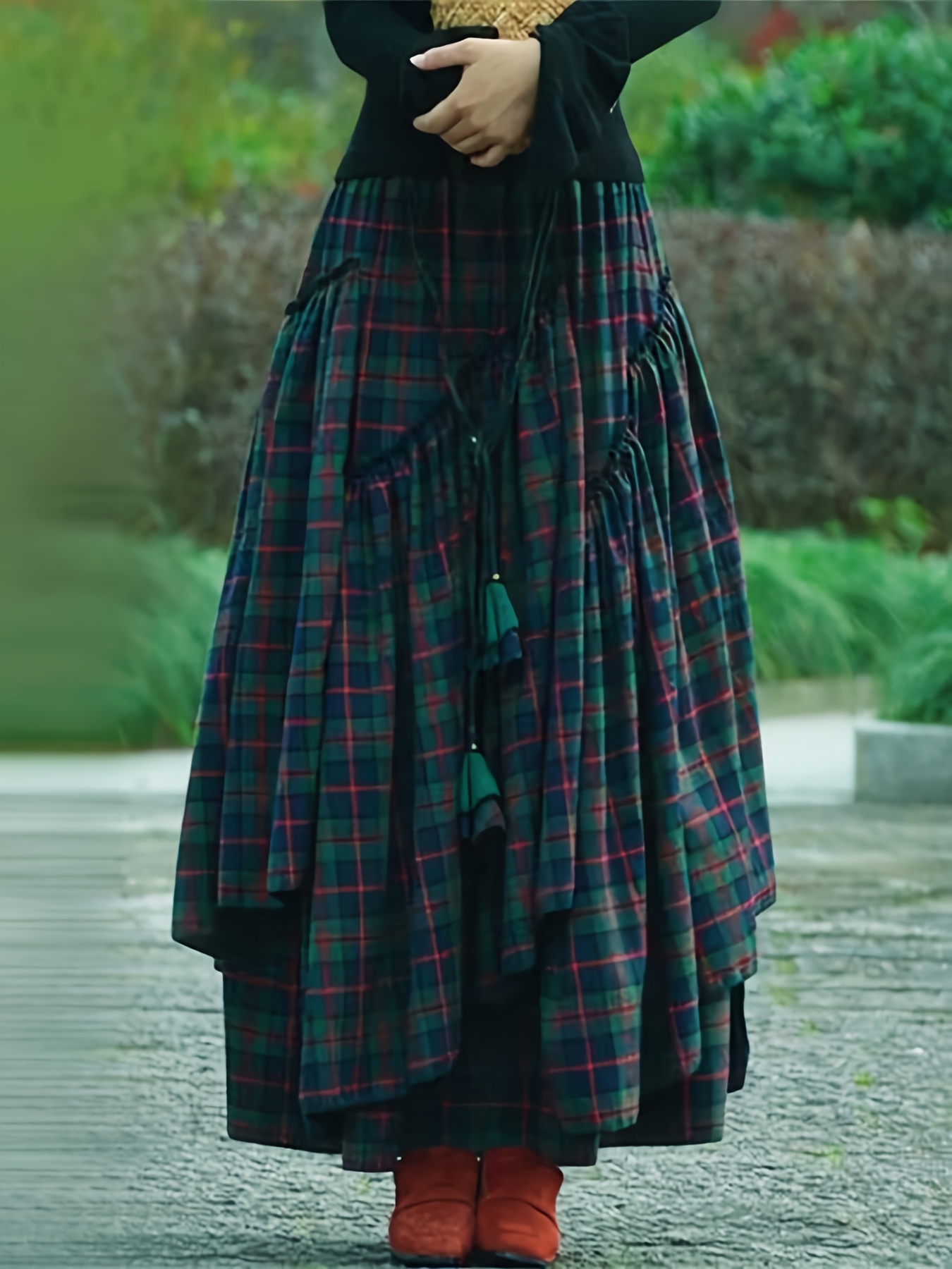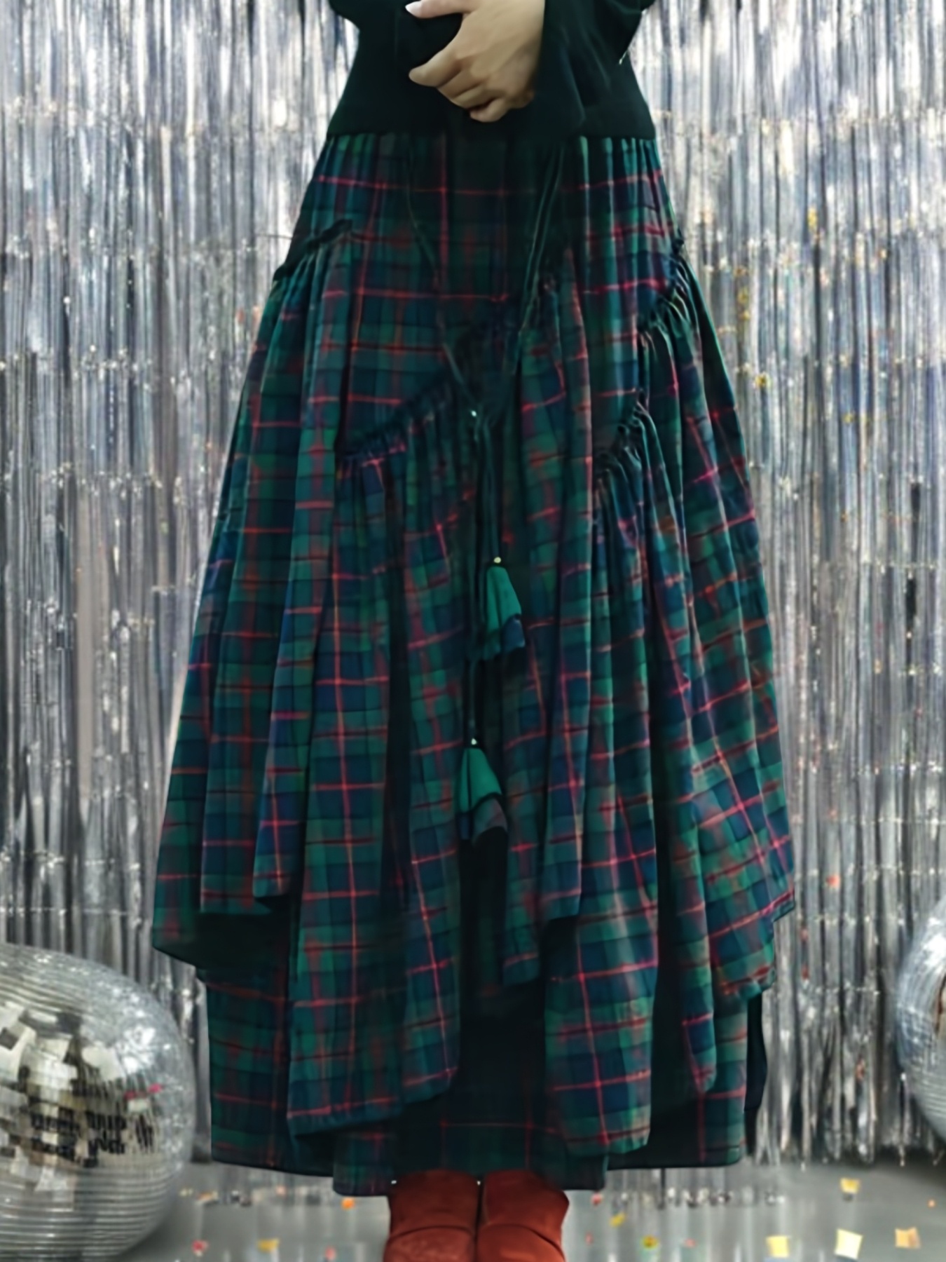 Victorian Gothic Handmade Tassel Plaid Skirt 2025 | Asymmetrical Pleated High-Waisted Beach Skirt | Elastic Waist Multi-Layer Vacation Dress | Sweet Style Women’S Gift for Spring and Summer