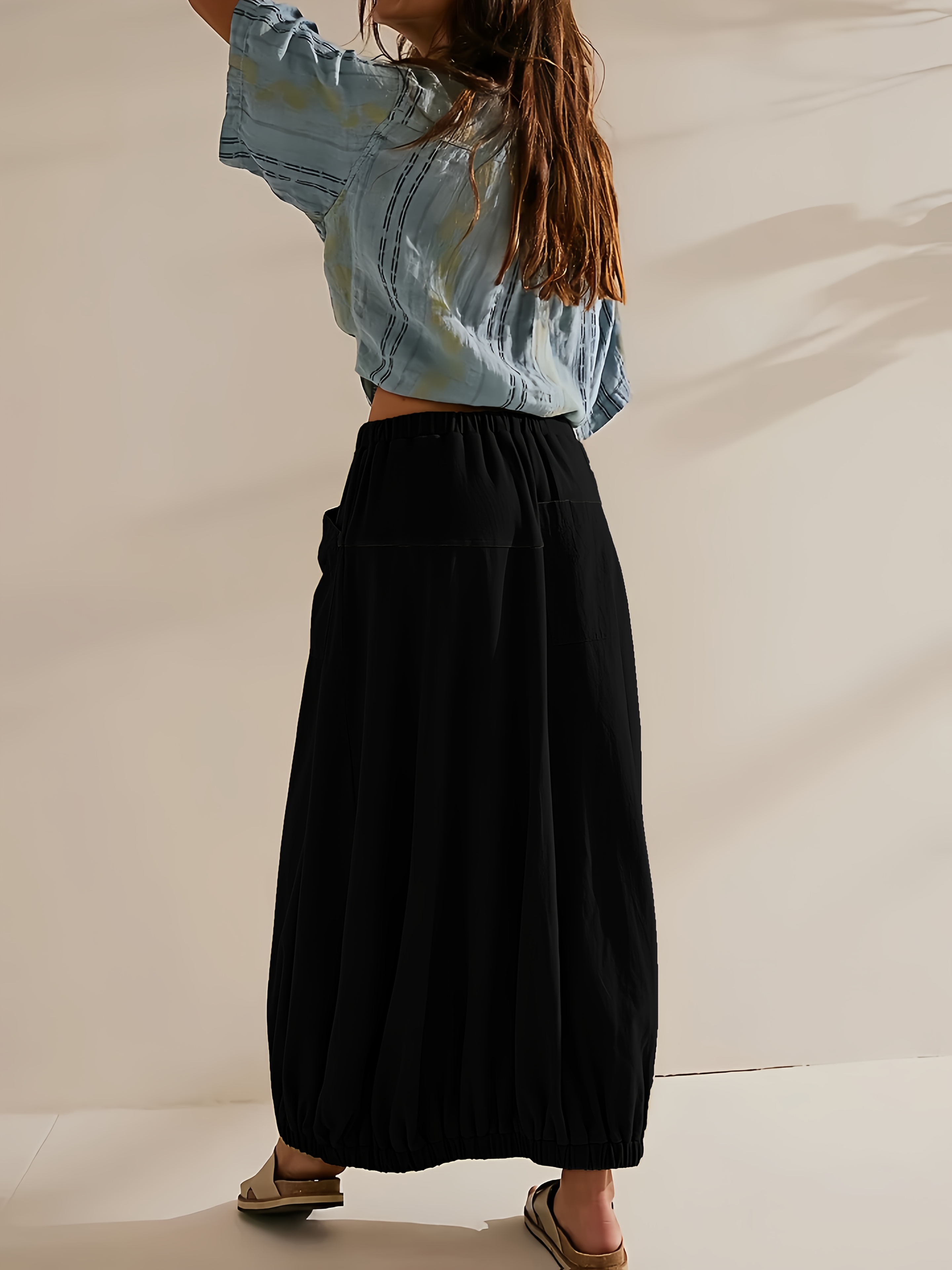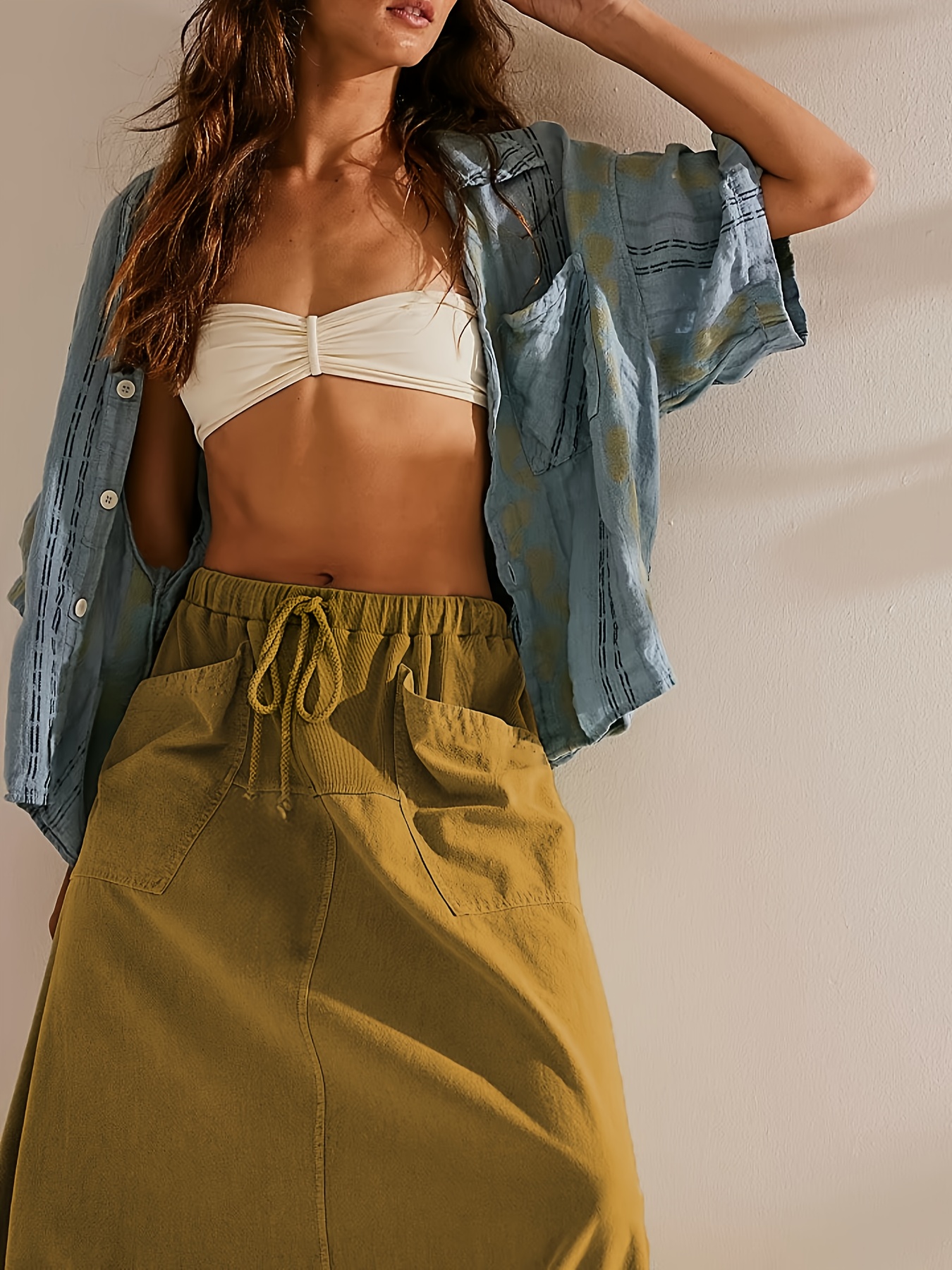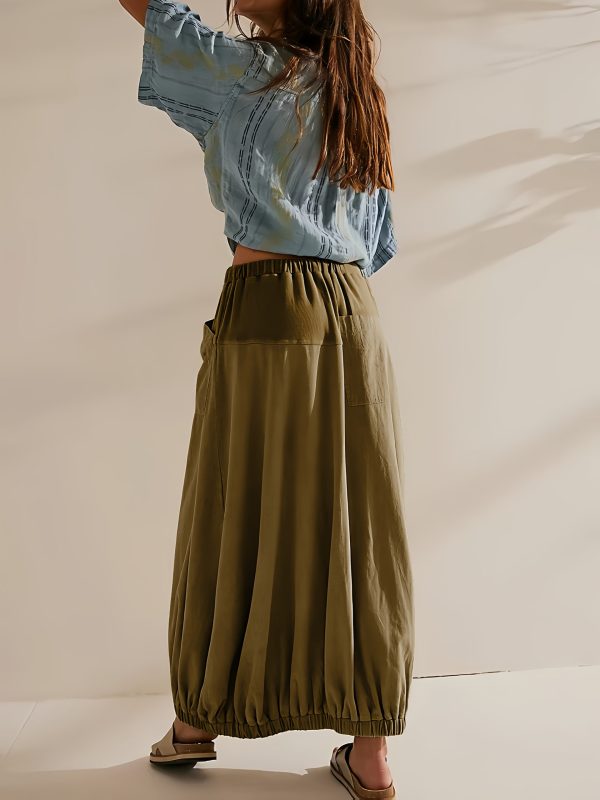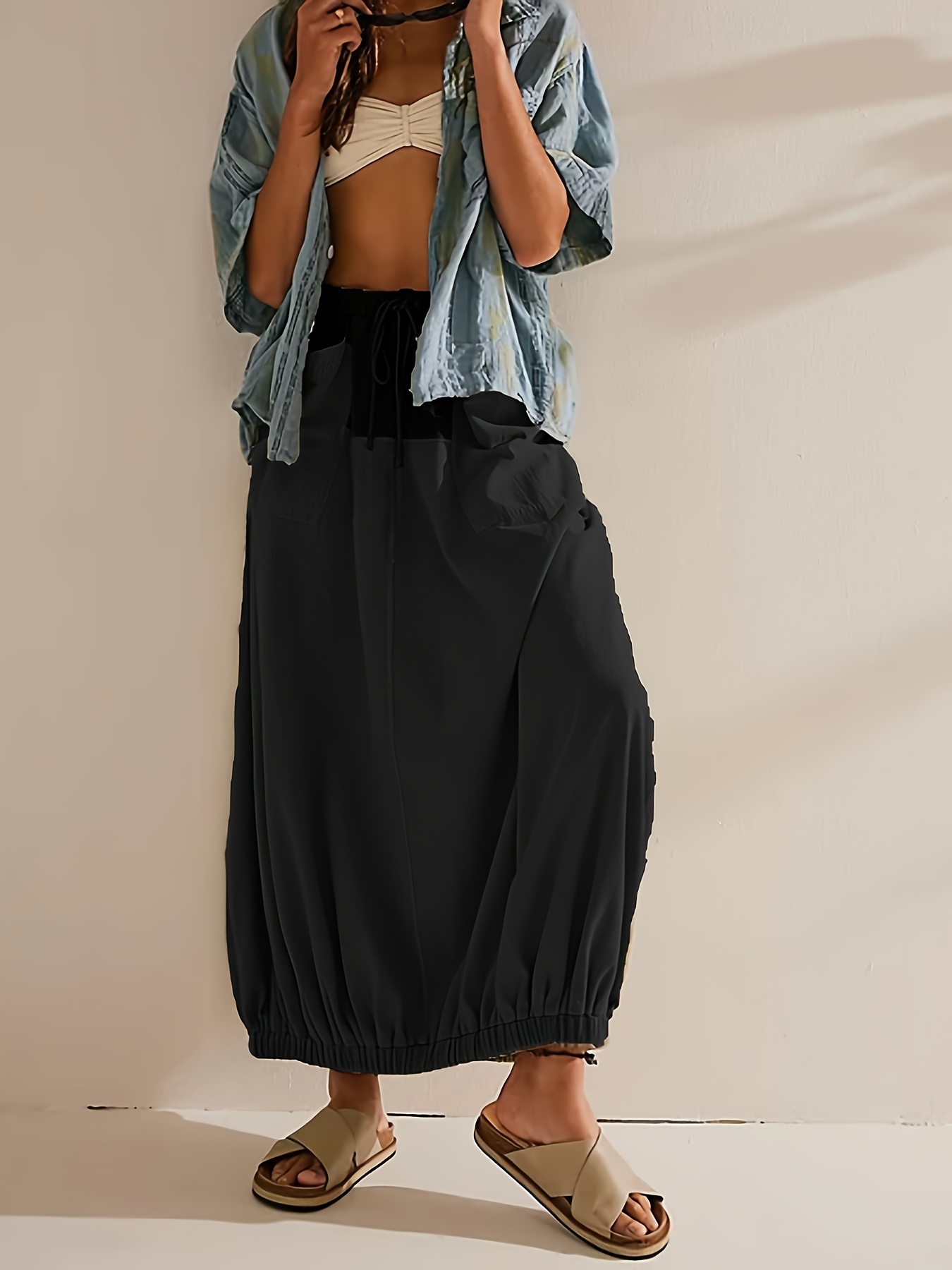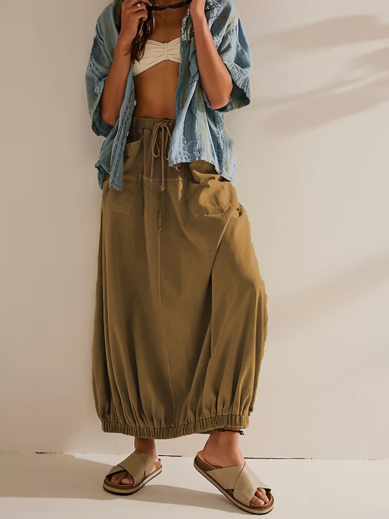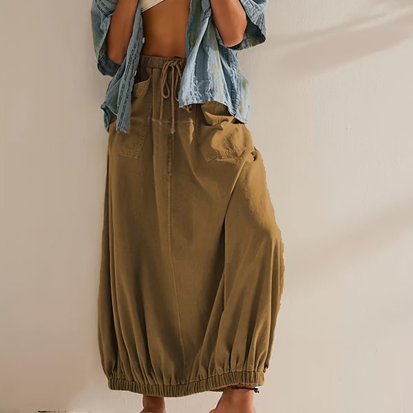 Vintage Maxi Skirt Polyester Women’s Vintage-Inspired Maxi Skirt with Drawstring Waist, Pockets, and Ruffled Hem – Ideal for Springu002FSummer, Casual Attire|Rustic Fashion|Drawstring Detail