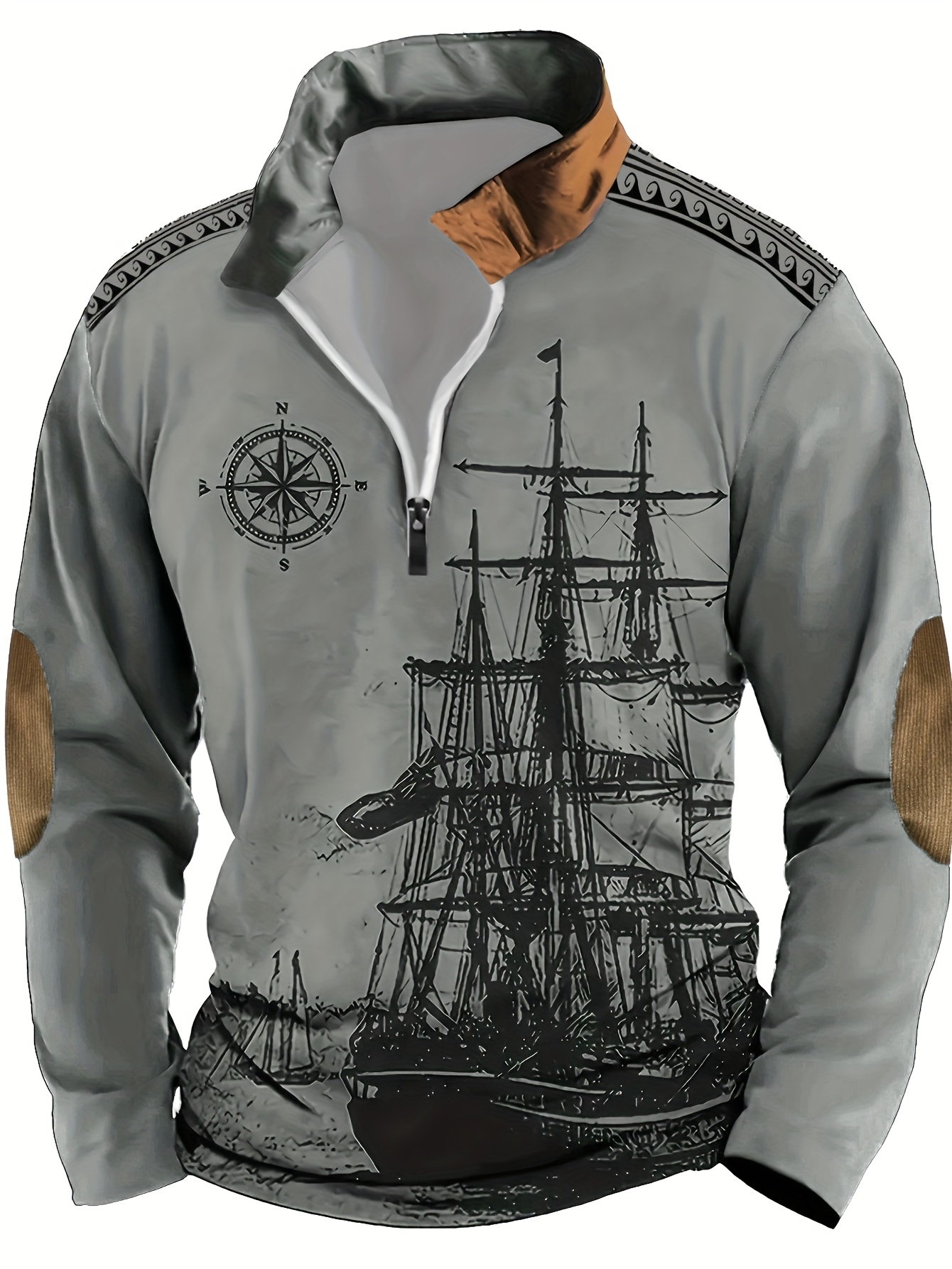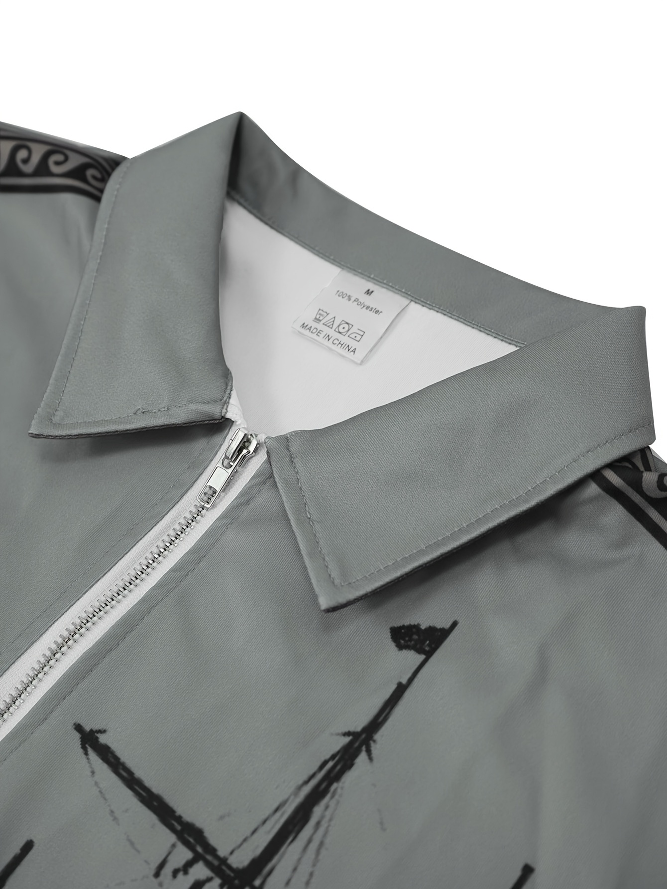 Vintage Polo Vintage Sailboat Print Long Sleeve Polo Shirt | Men’s Casual Knit 100% Polyester, Regular Fit with Lapel Collar and Zipper, Slight Stretch, 180gsm – Fall Collection