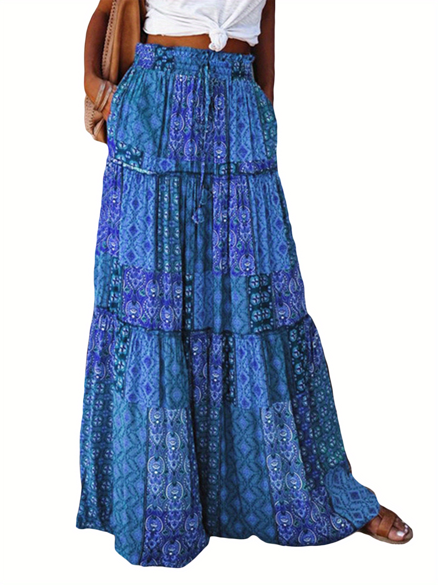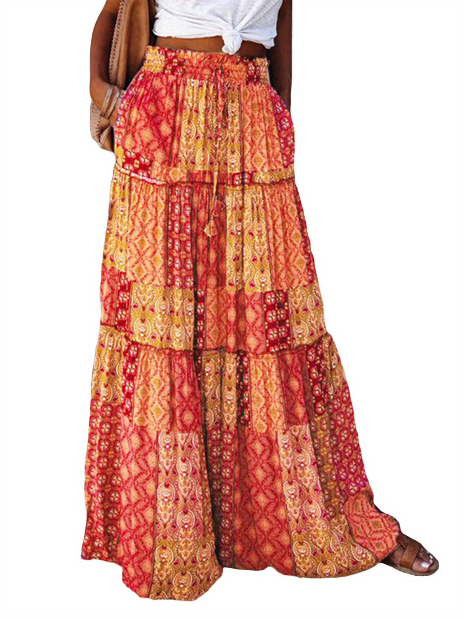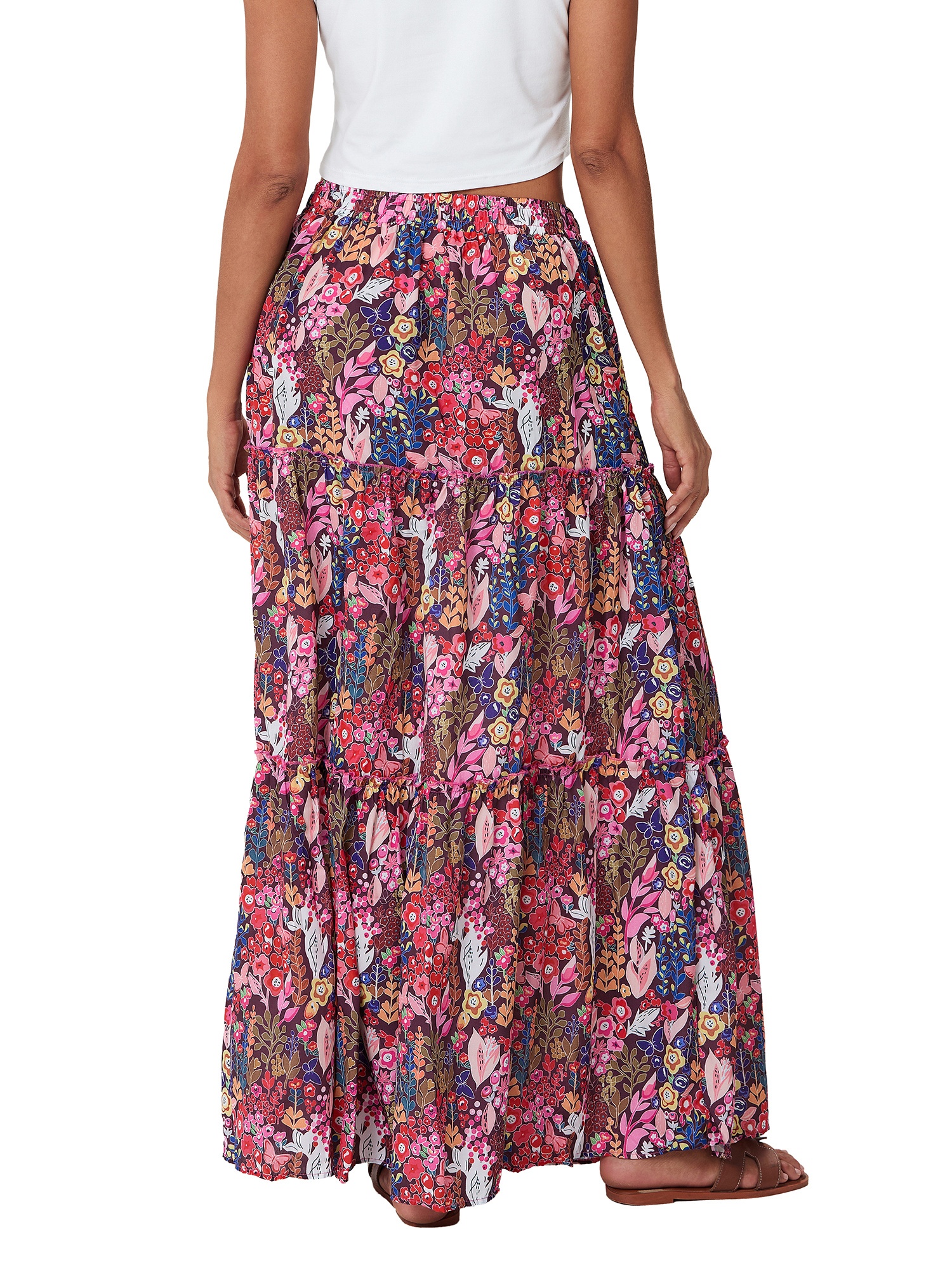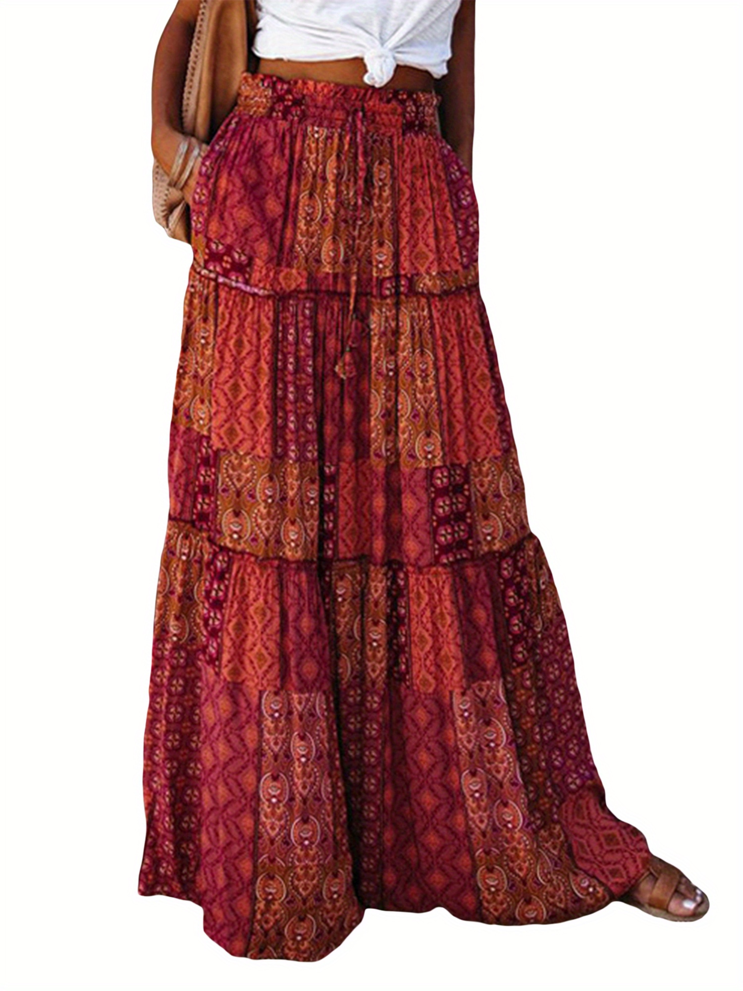 Women’s Bohemian High-Waist A-Line Tiered Skirt with Pockets – Vintage Floral Print, Lightweight Polyester, Ruffled Hem, Ideal for All Seasons, High Waisted Skirt