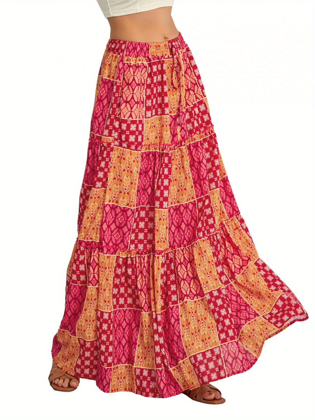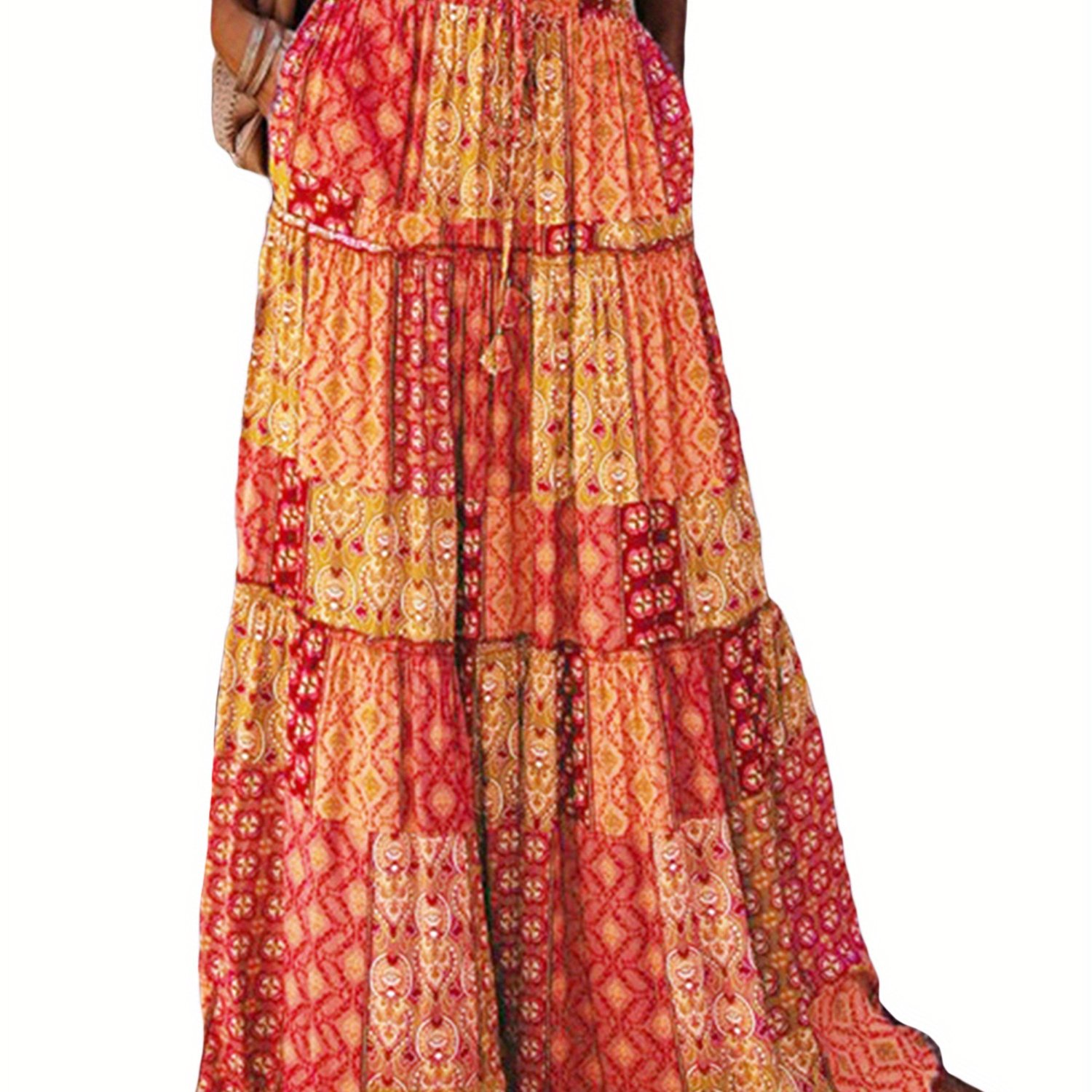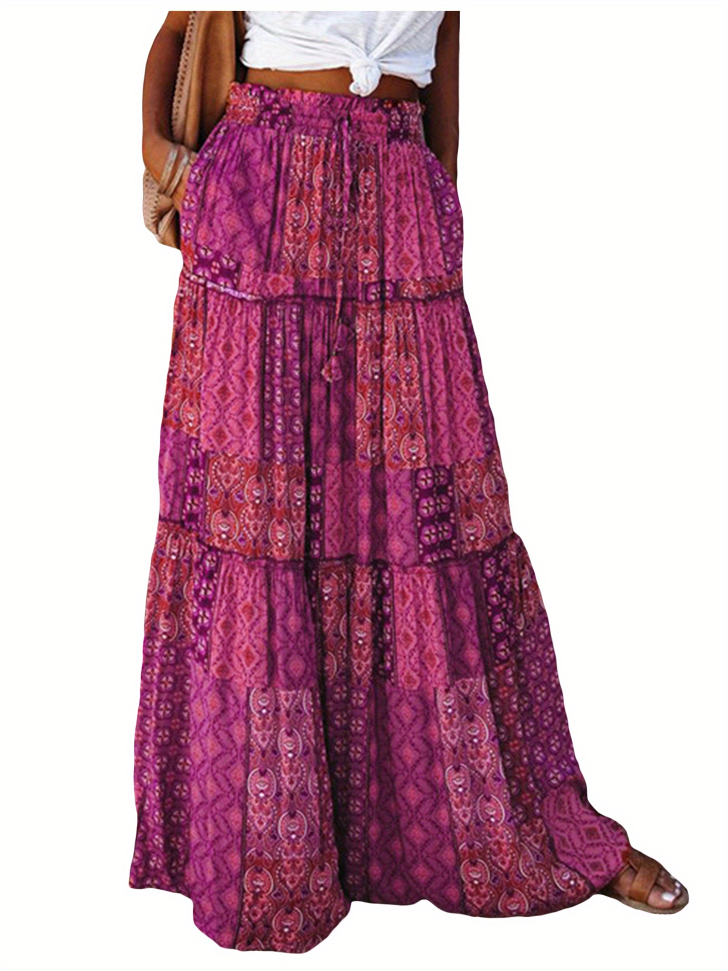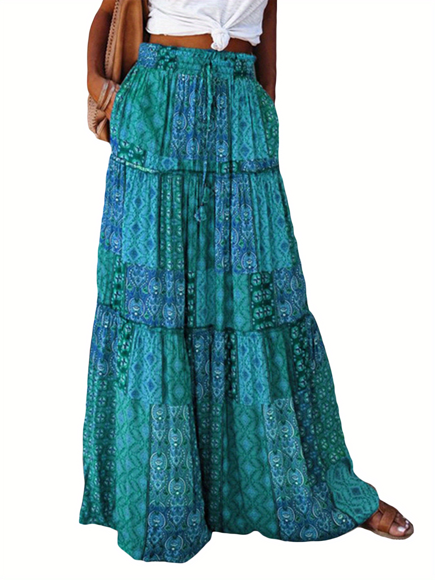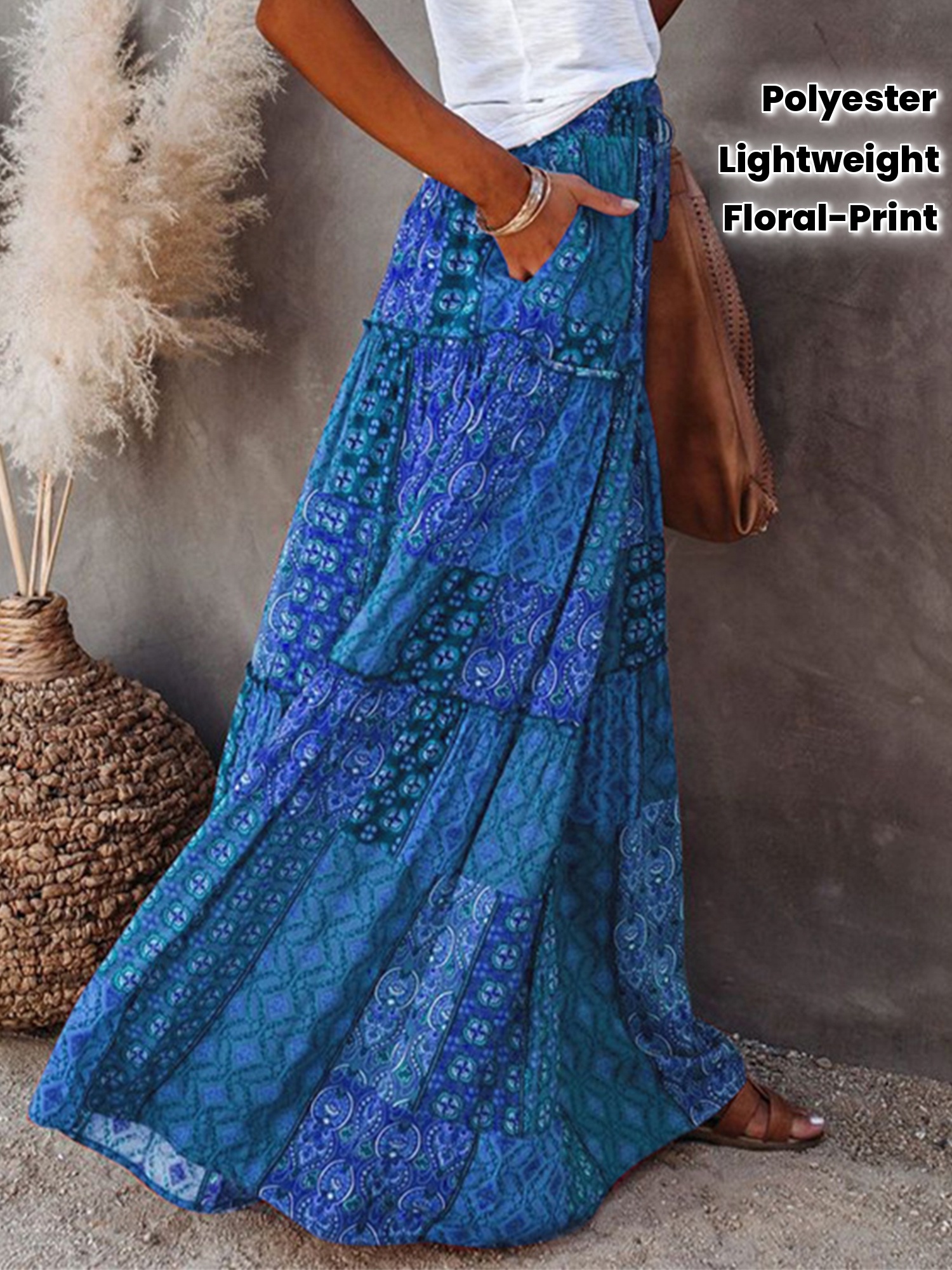Women’s Bohemian High-Waist A-Line Tiered Skirt with Pockets – Vintage Floral Print, Lightweight Polyester, Ruffled Hem, Ideal for All Seasons, High Waisted Skirt