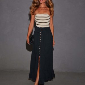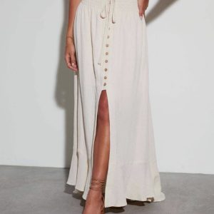Women’S Elastic Tie Waist Button Maxi Skirts Casual Loose Flowy Swing Slit Front Dress