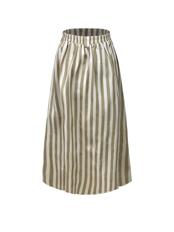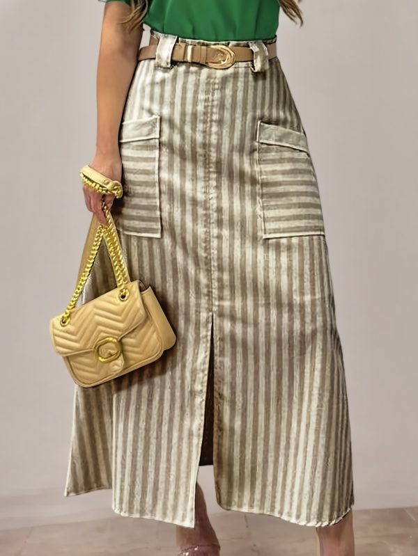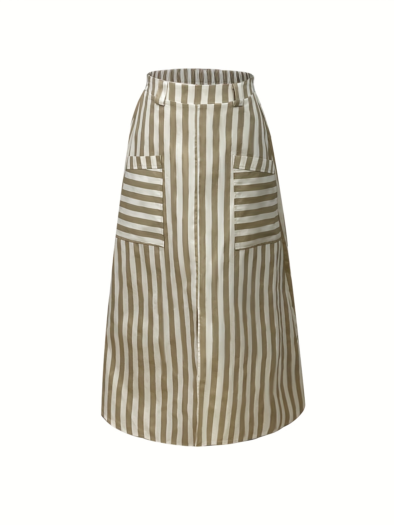 - Women’s Elegant High-Waisted Midi Skirt – Flowy, White & Beige Striped, with Pockets, Versatile Summer Skirt