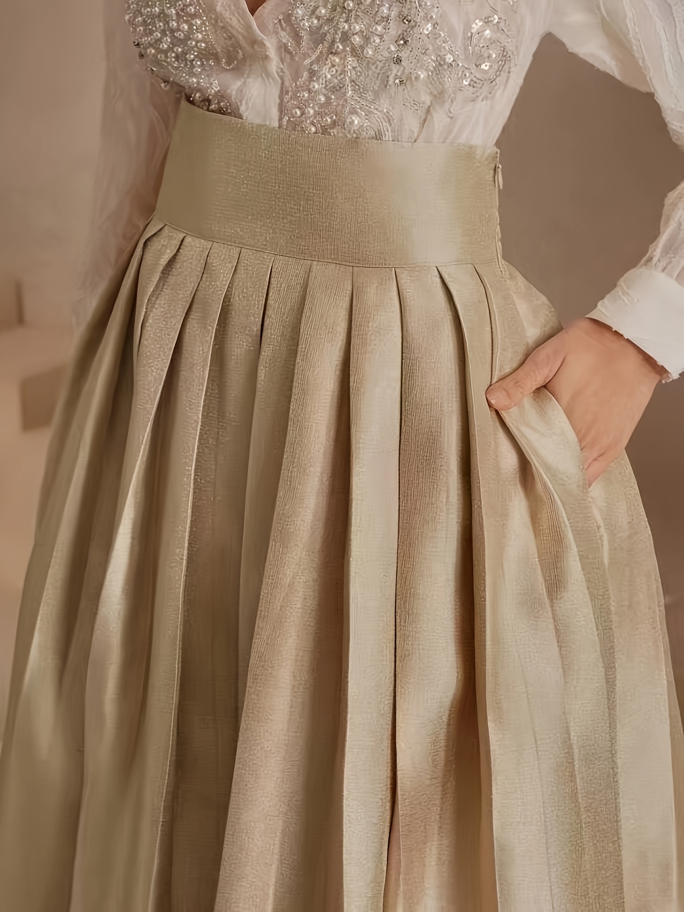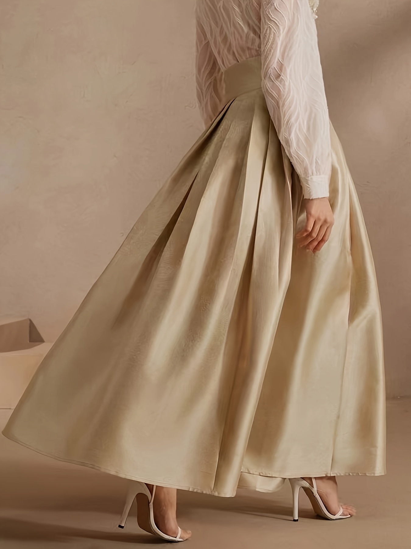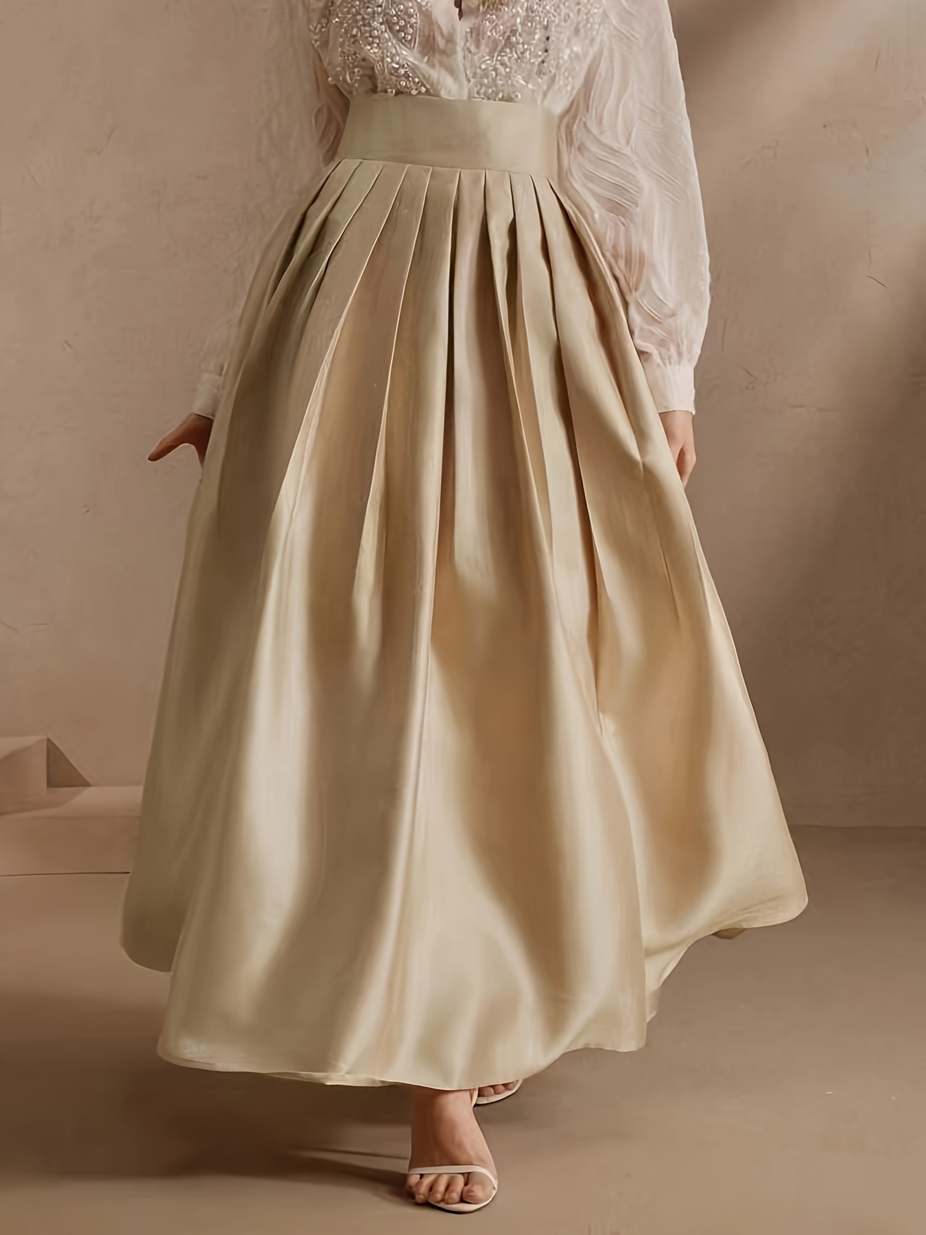 Women’S Elegant High-Waisted Pleated Midi Skirt – Beige, Long Flowing Design with Ruffled Hem, Perfect for Summer, Versatile Fashion|Ruffled Hem Skirt|Sleek Appearance