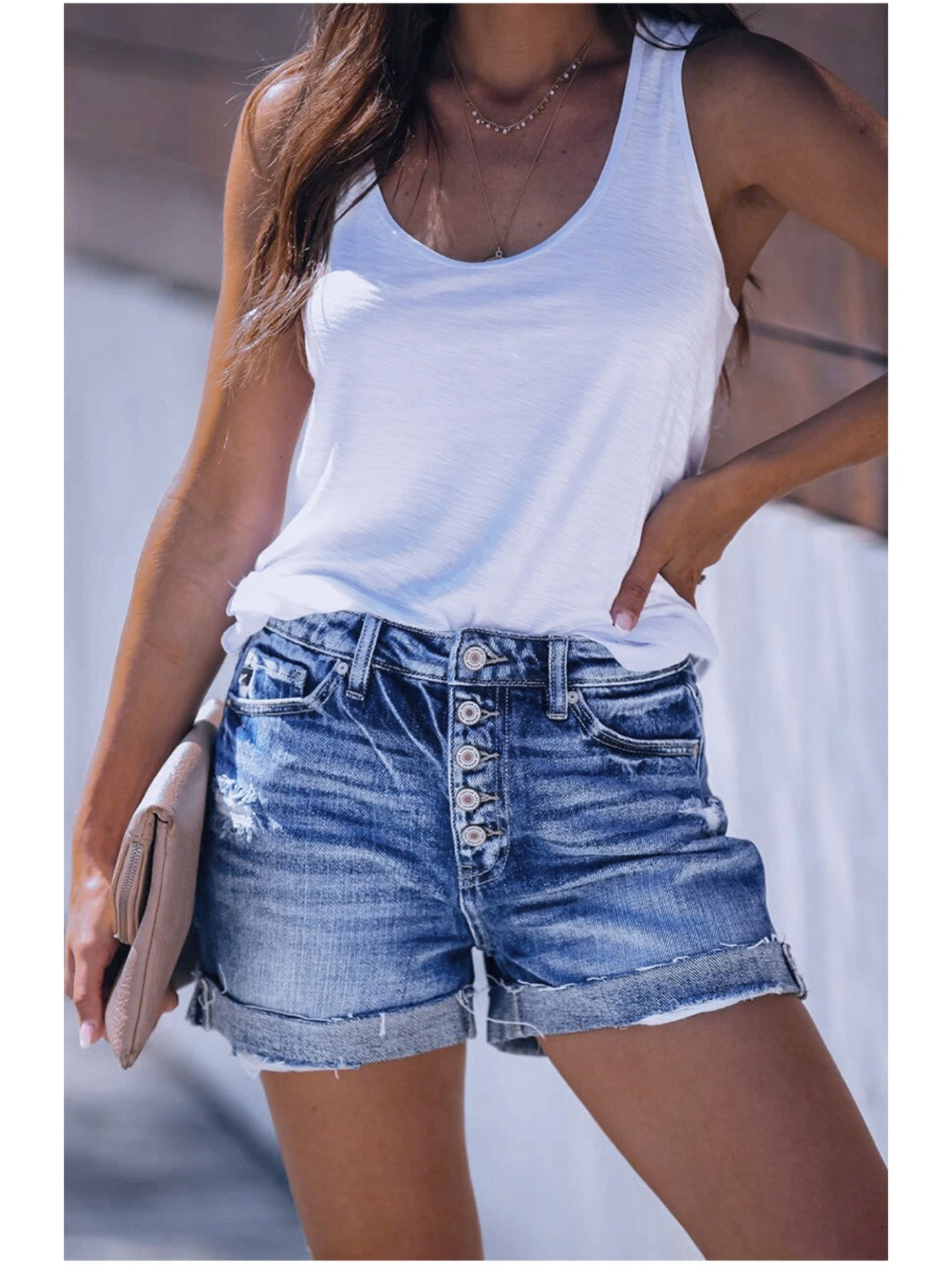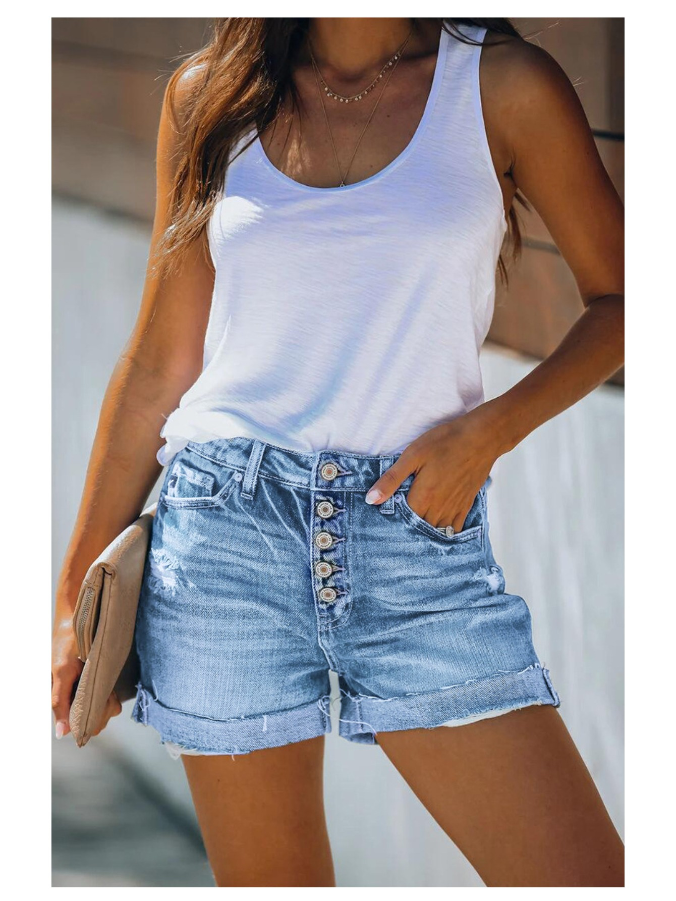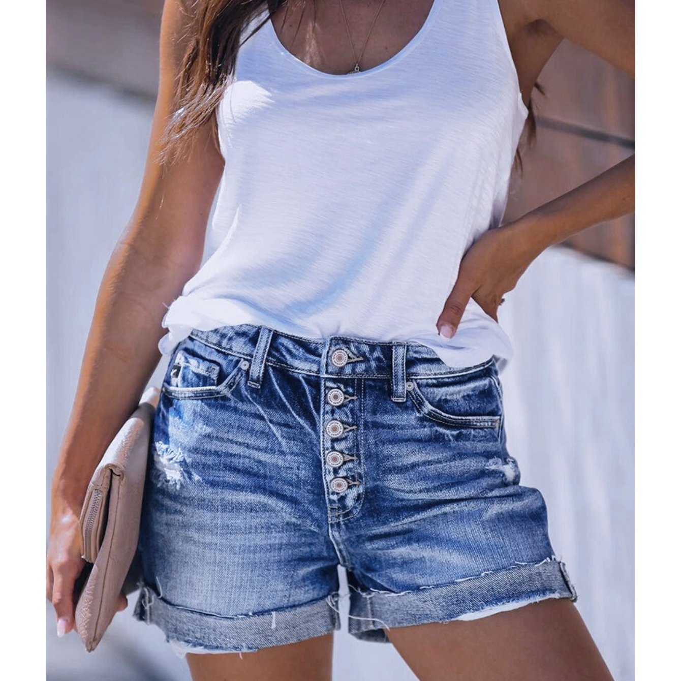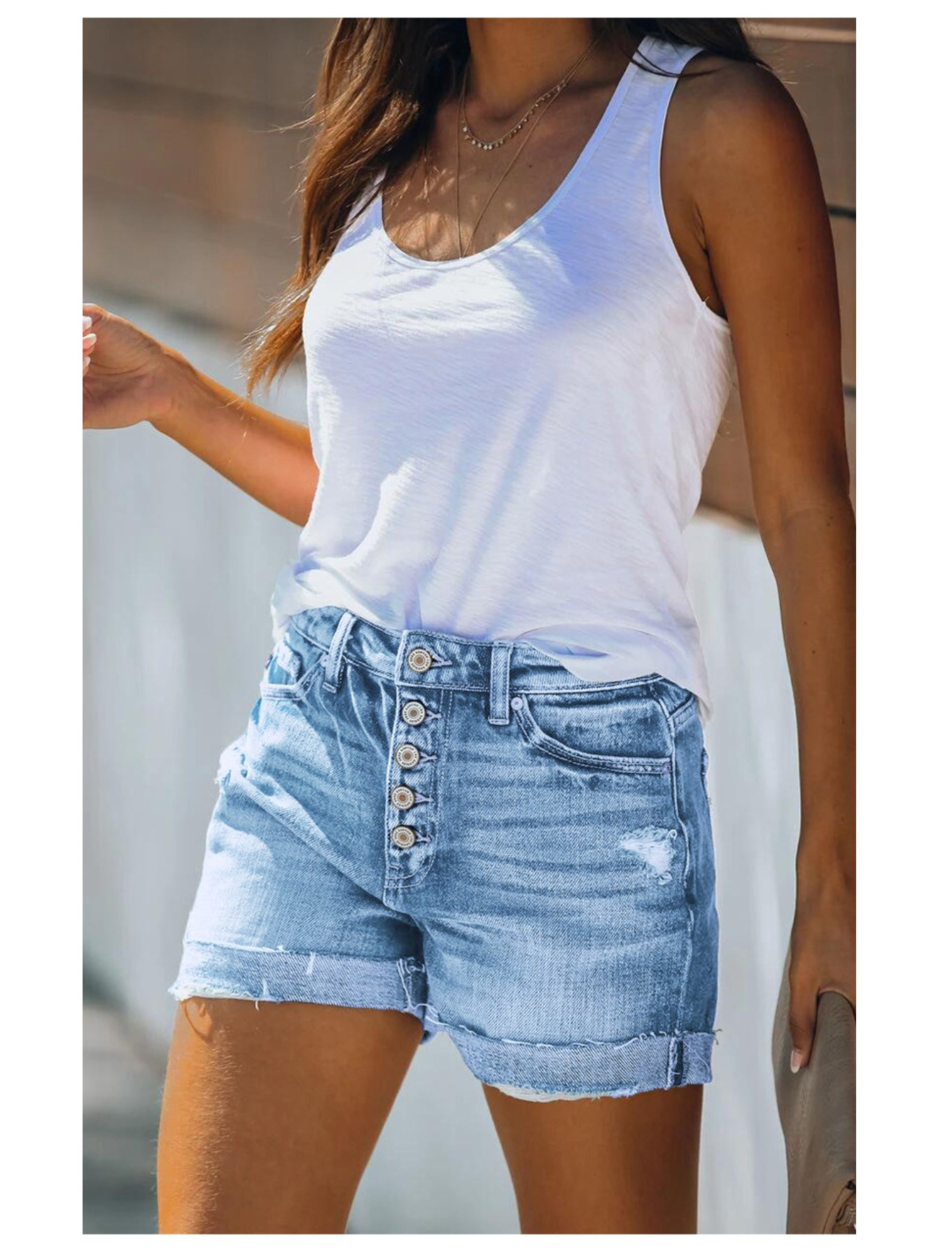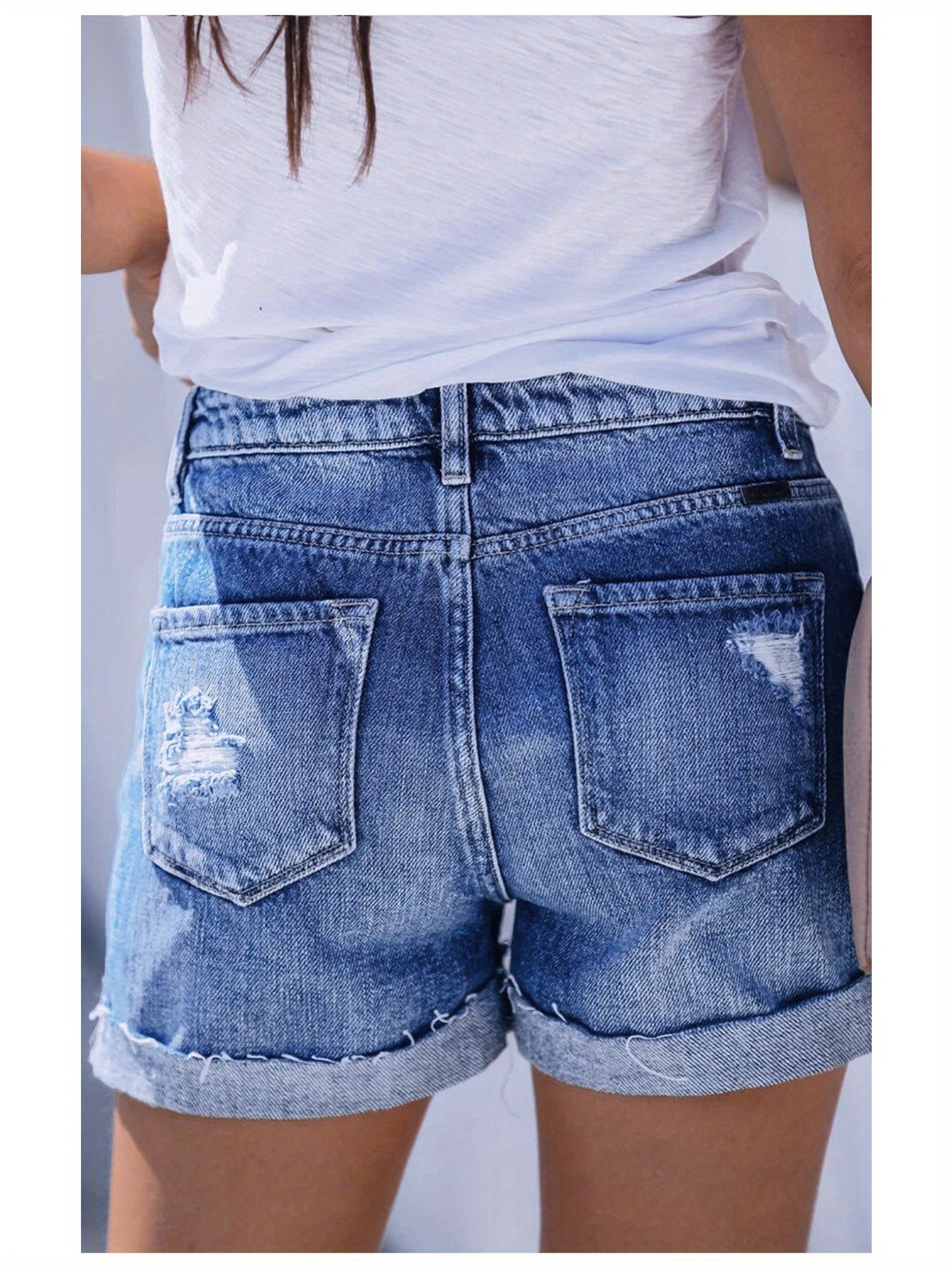 Women’S High-Rise Ripped Denim Shorts Casual Fashion Multi-buttonSummer Stretchy Jean Shorts with Frayed Raw Hem