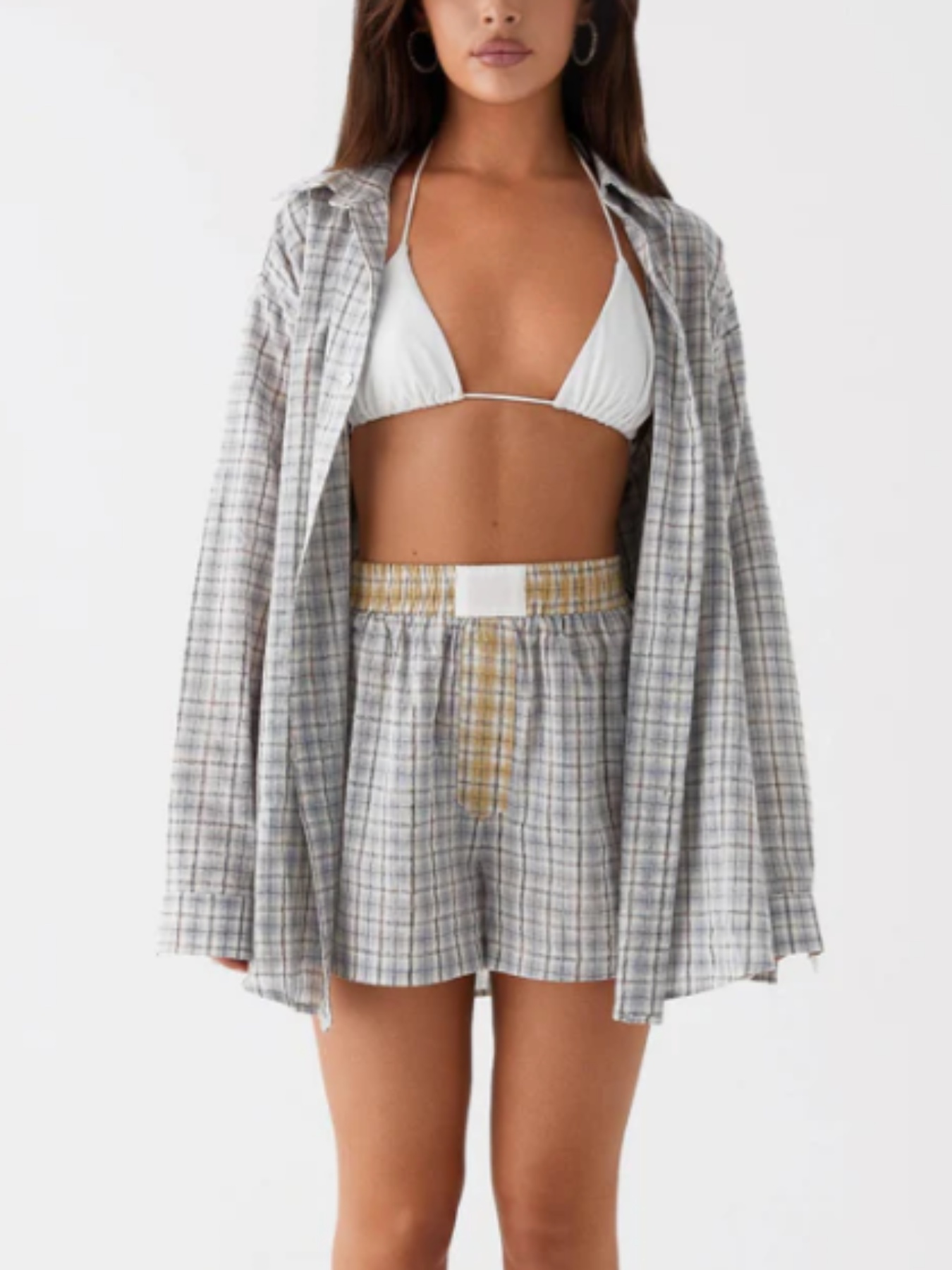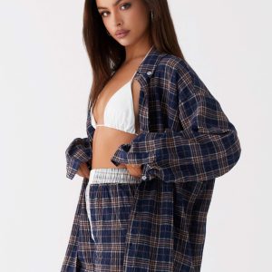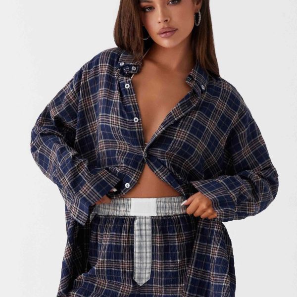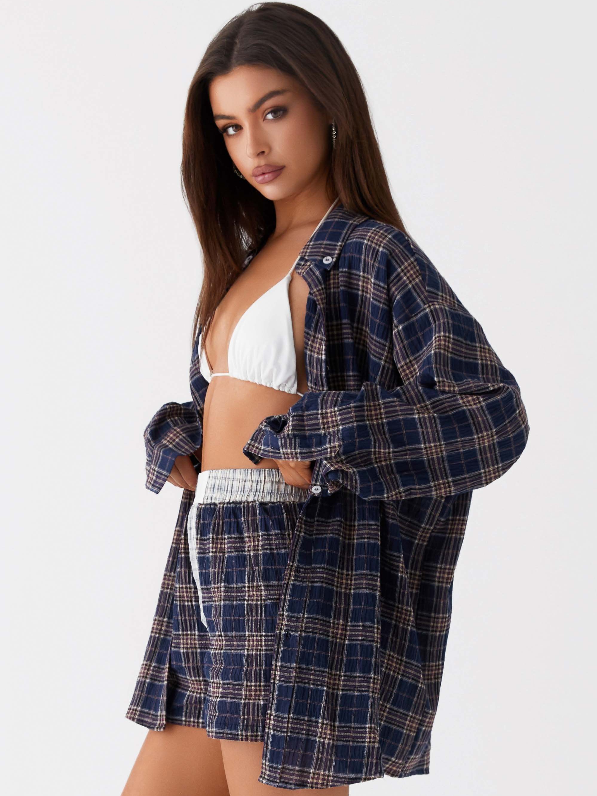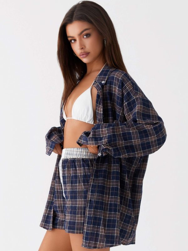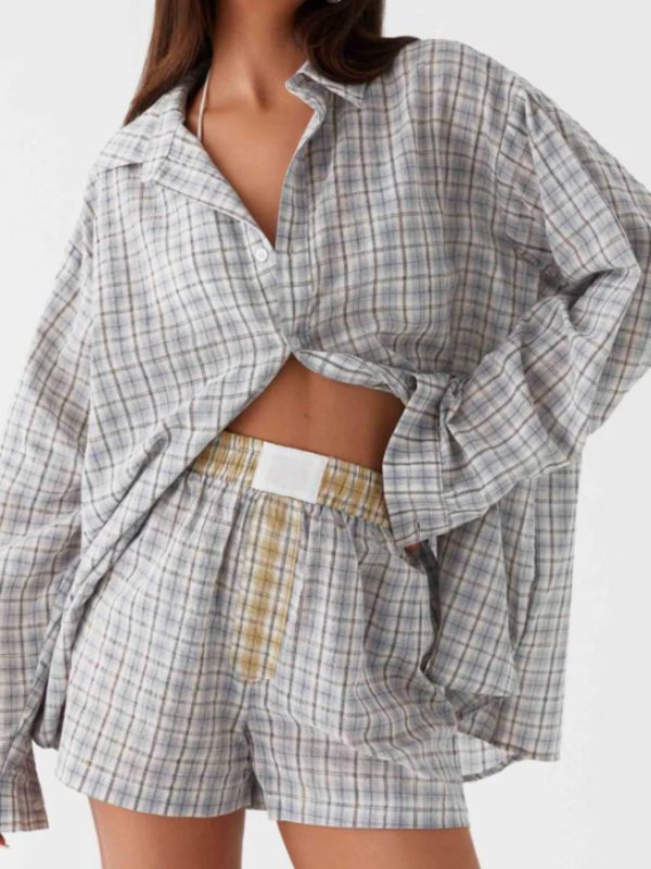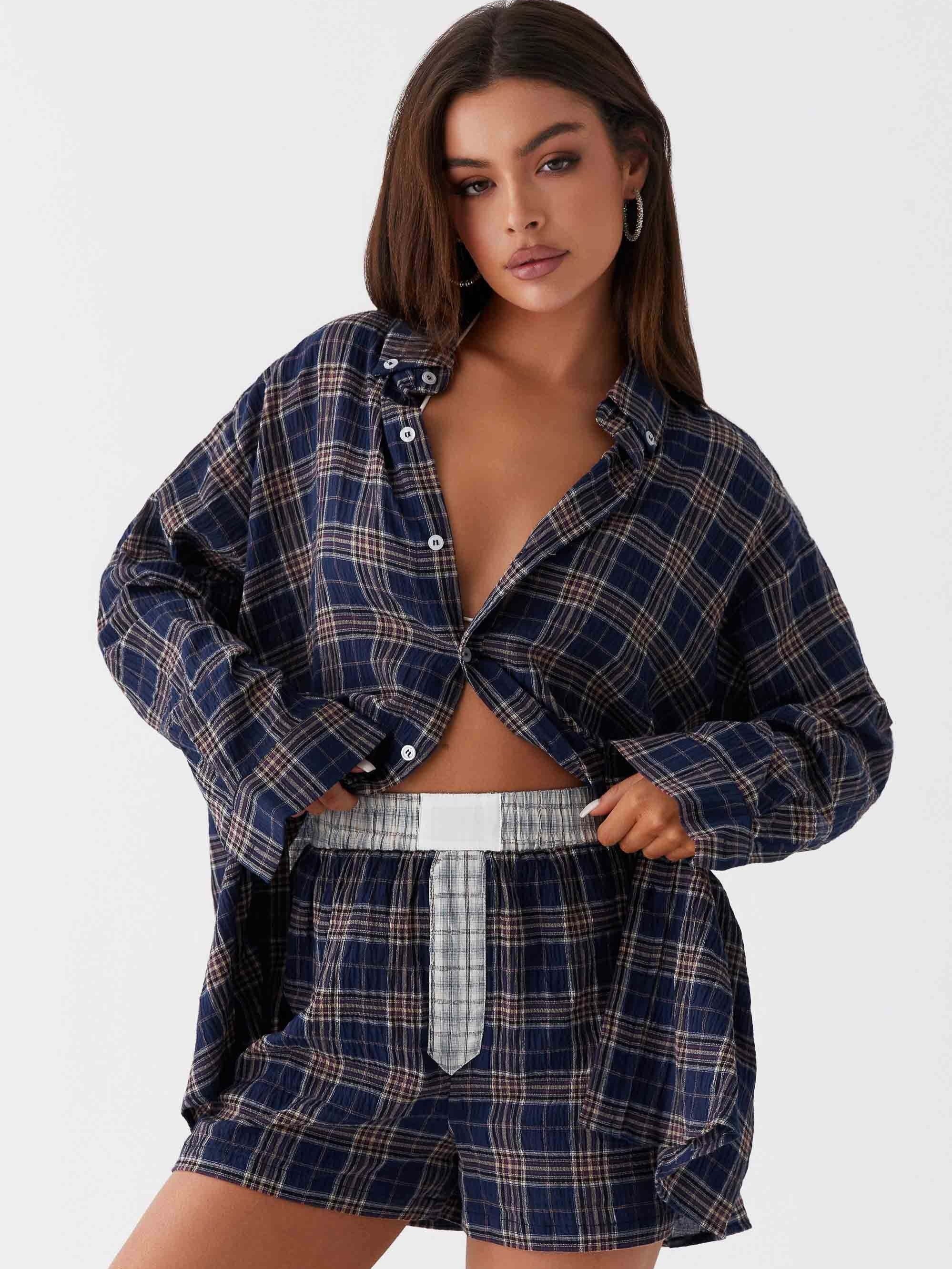 - Women’s Plaid Button-Patchwork Shirt Shorts Home Set Blue