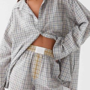 Be the first to review “Women’s Plaid Button-Patchwork Shirt Shorts Home Set Blue” Cancel reply