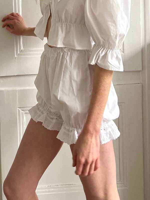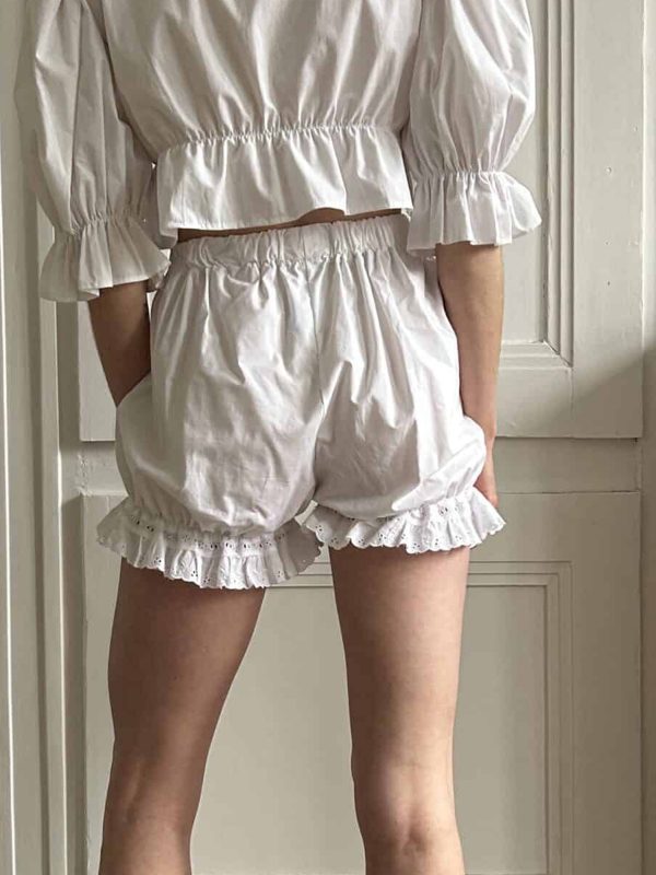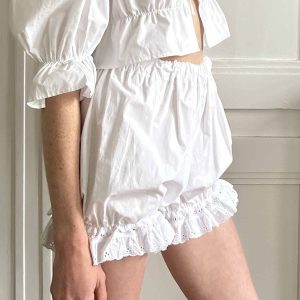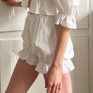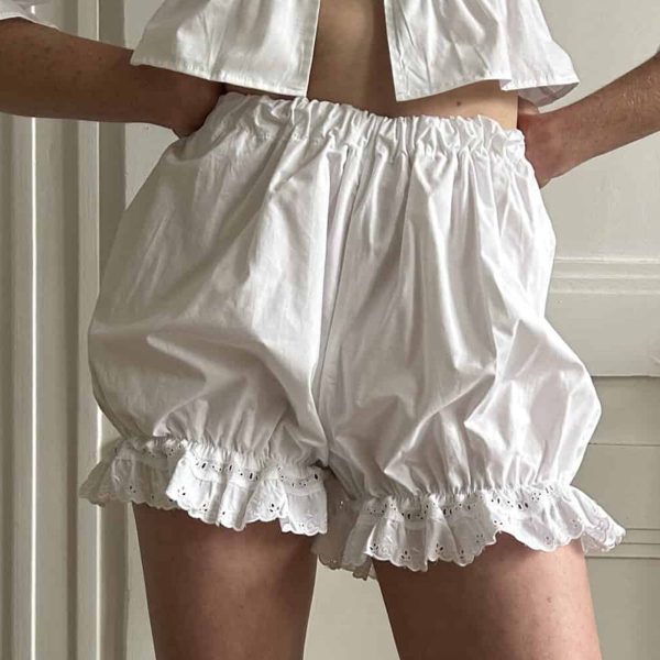 Women’s White Frilly Bloomers – Embroidered Mesh Waist, Elastic Casual Summer Shorts with Ruffled Hem & Lace Detailing, Loose Fit for Springu002FSummer, Summer Clothing | Frilly Hem Bloomers | Mesh Fabric Shorts