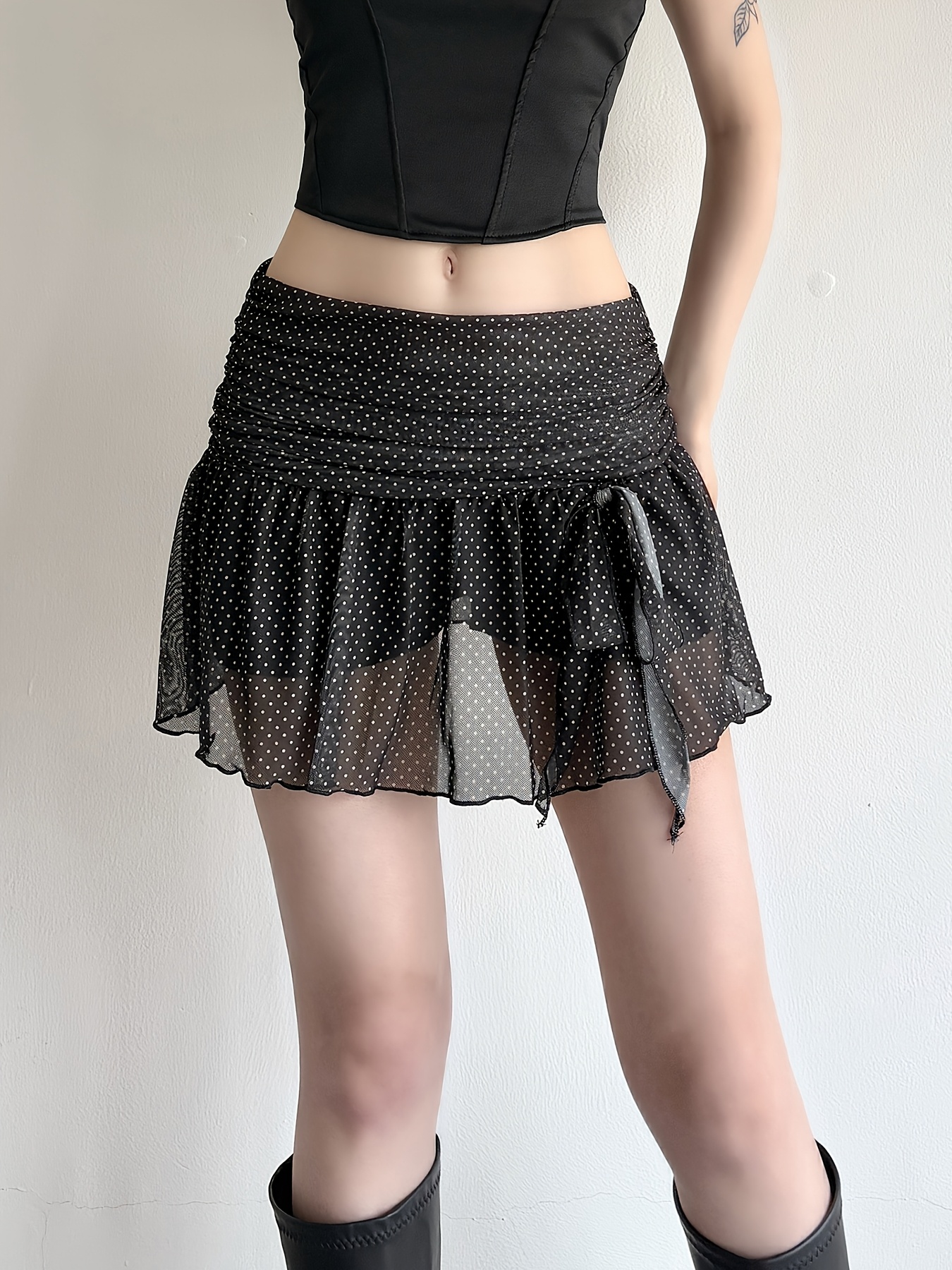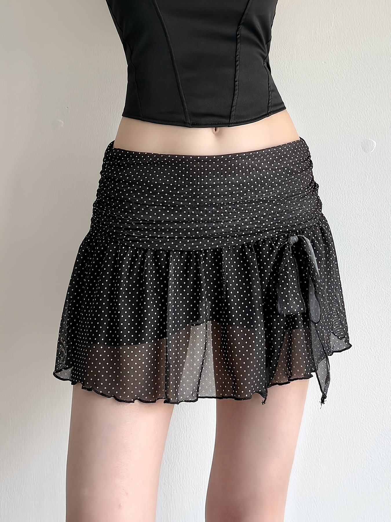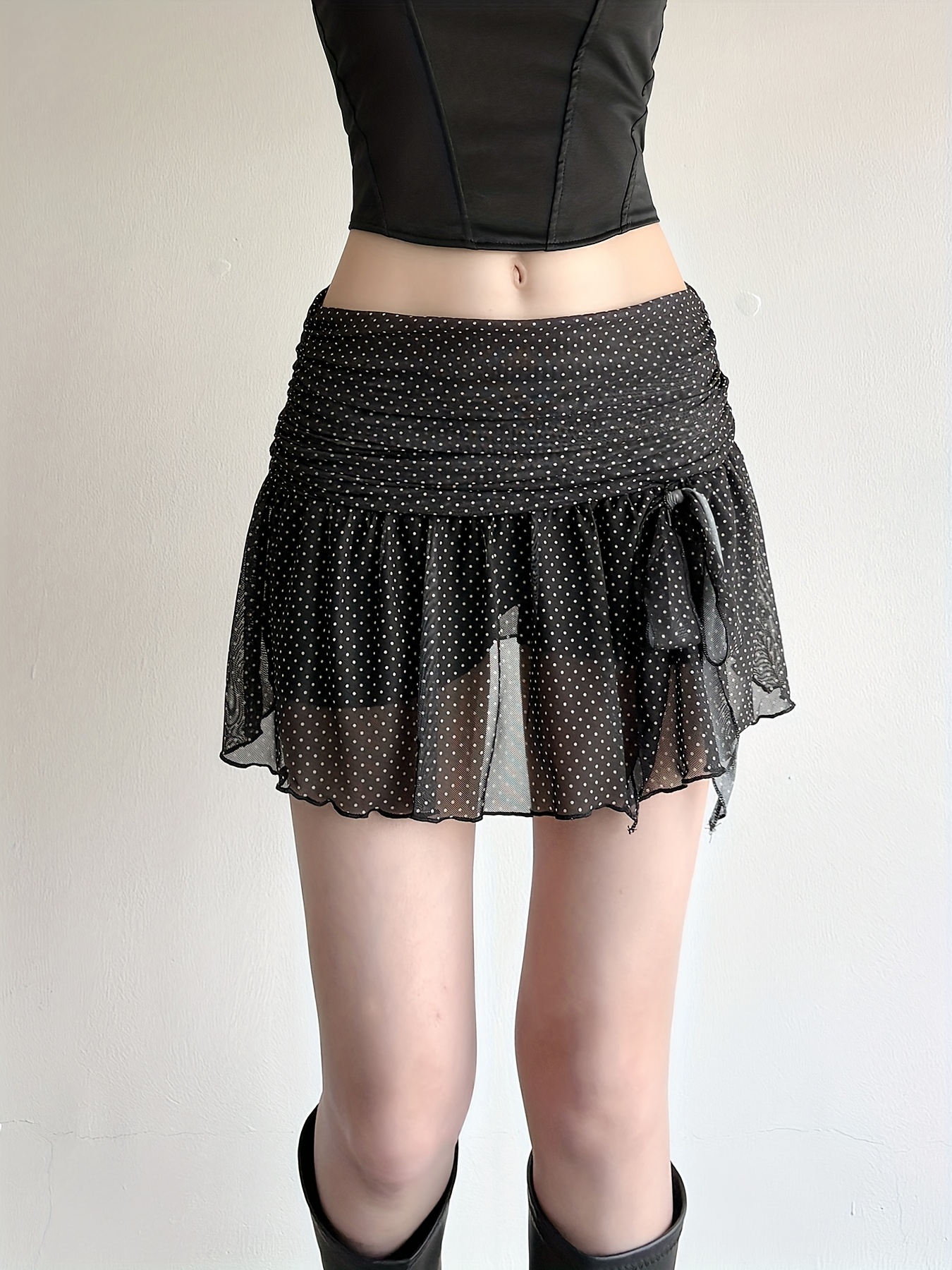 Women’s Y2K Cute Polka Dot A-Line Skirt with Built-In Shorts & Ruffled Hem – Black & White Contrast Bow Detail, Machine Washable Non-Stretch Fabric for Casual to Semi-Formal Wear, Cute Skirts, Versatile Fashion, Tulle Mesh Fabric